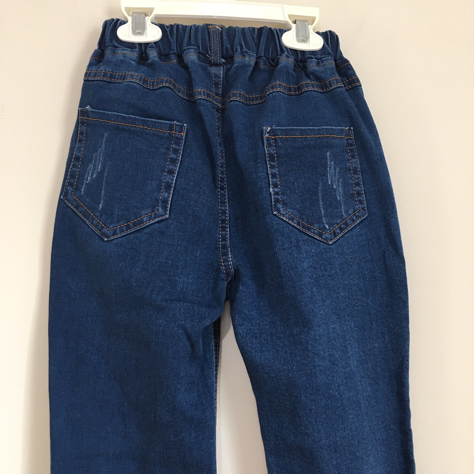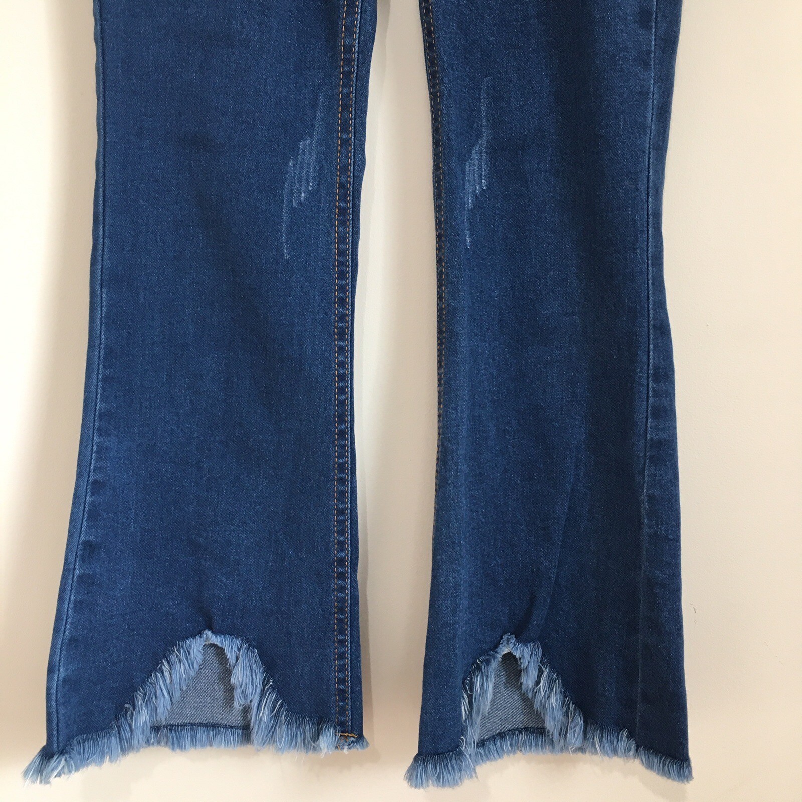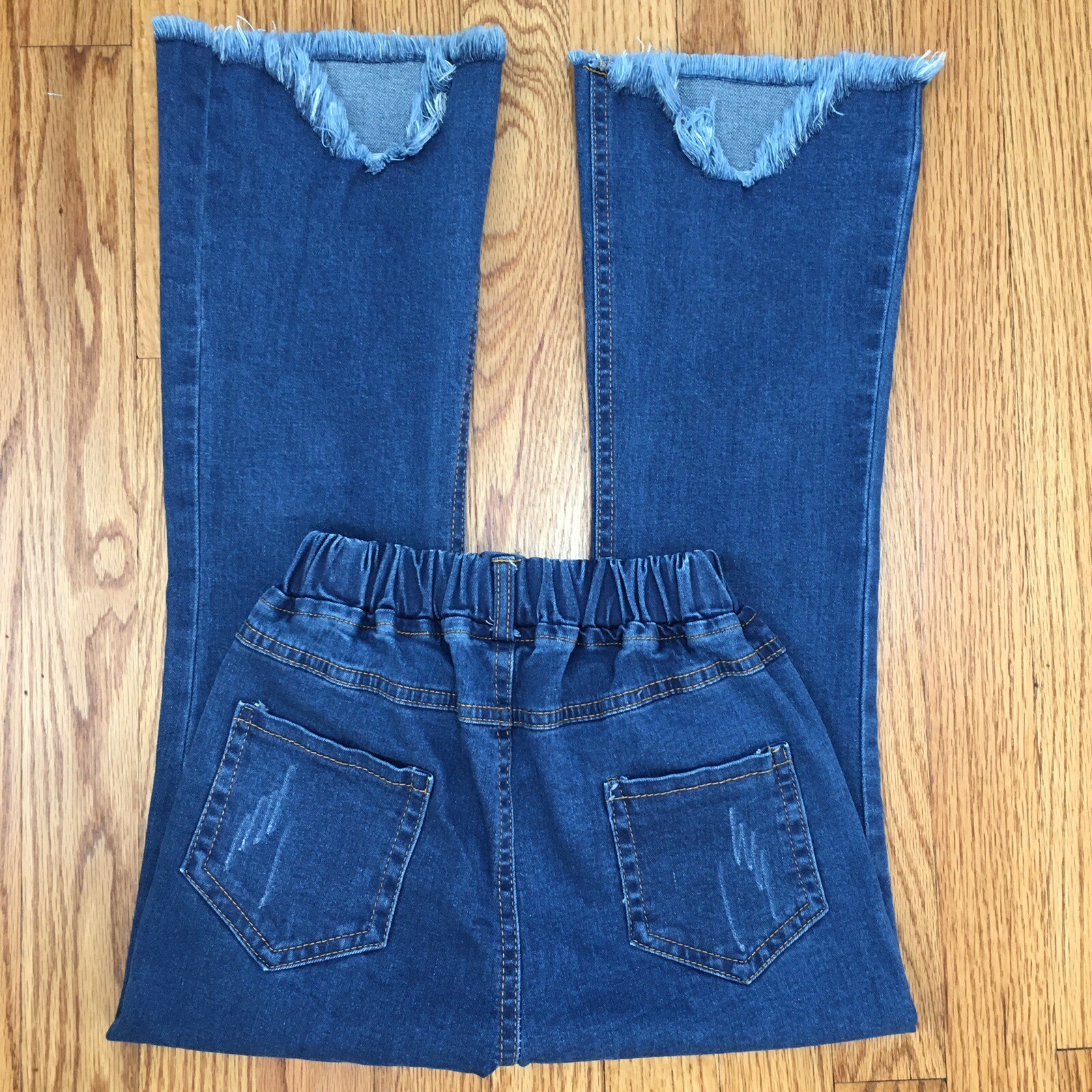 Little girls high waist flare leg raw hem pull on denim blue jeans