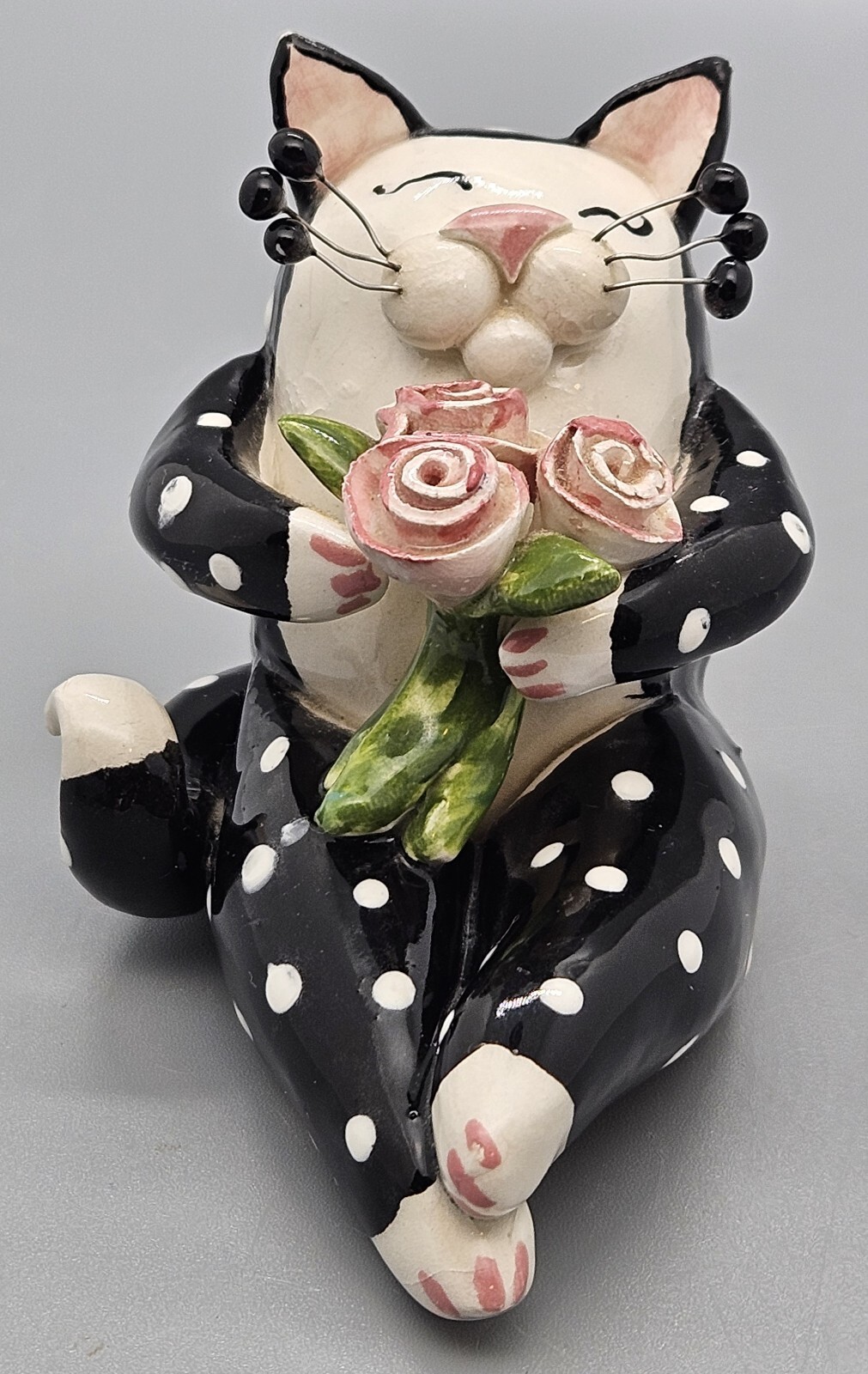 Amy Lacombe Black and White Polkadot Cat Holding Roses. 1998. Signed.