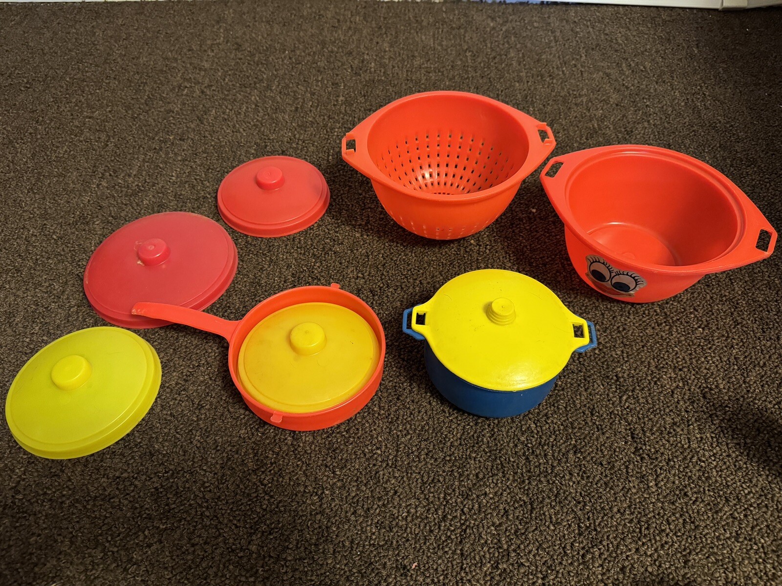 как выглядит Vintage Mixed Hard Plastic Lot of 58 Pretend Play Kitchen Toys, Plates,Cups,Pans фото