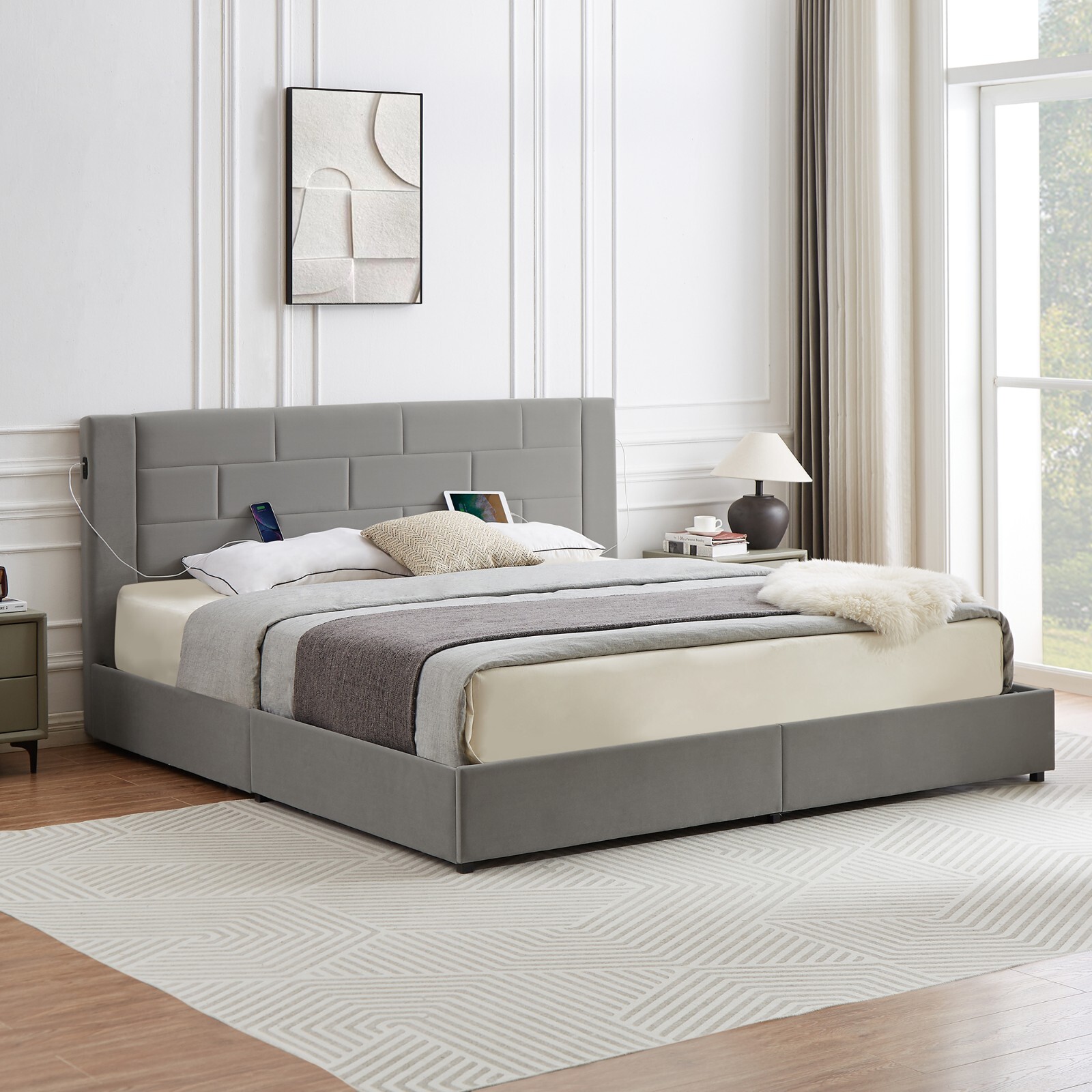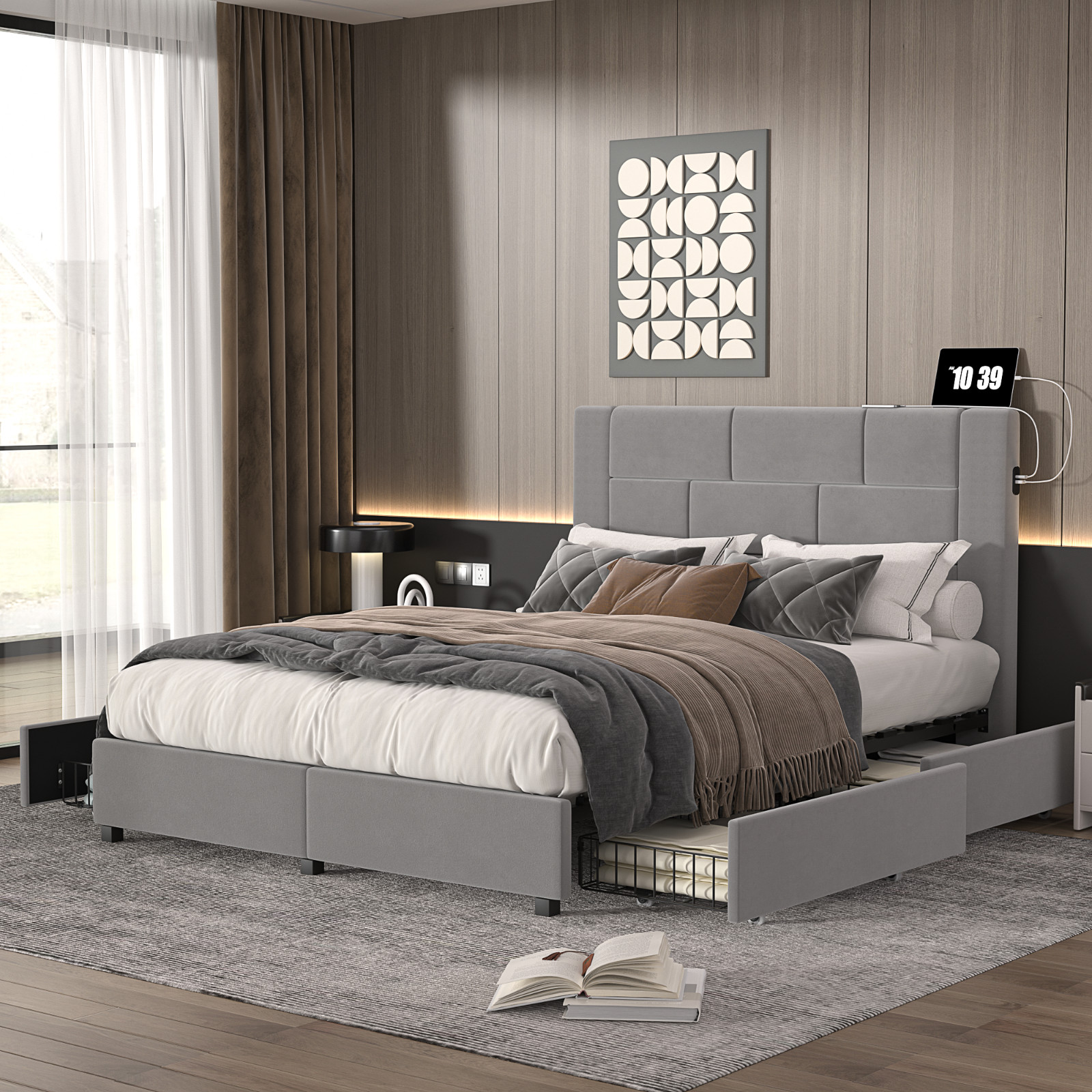 Full/Queen/King Upholstered Bed Frame w/ 2 Side USB Ports and 4 Storage Drawers