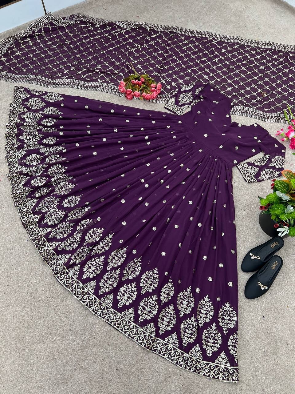 Indian Latest Wedding Wear Designer Purple Faux Georgette Gown Fancy Dupatta