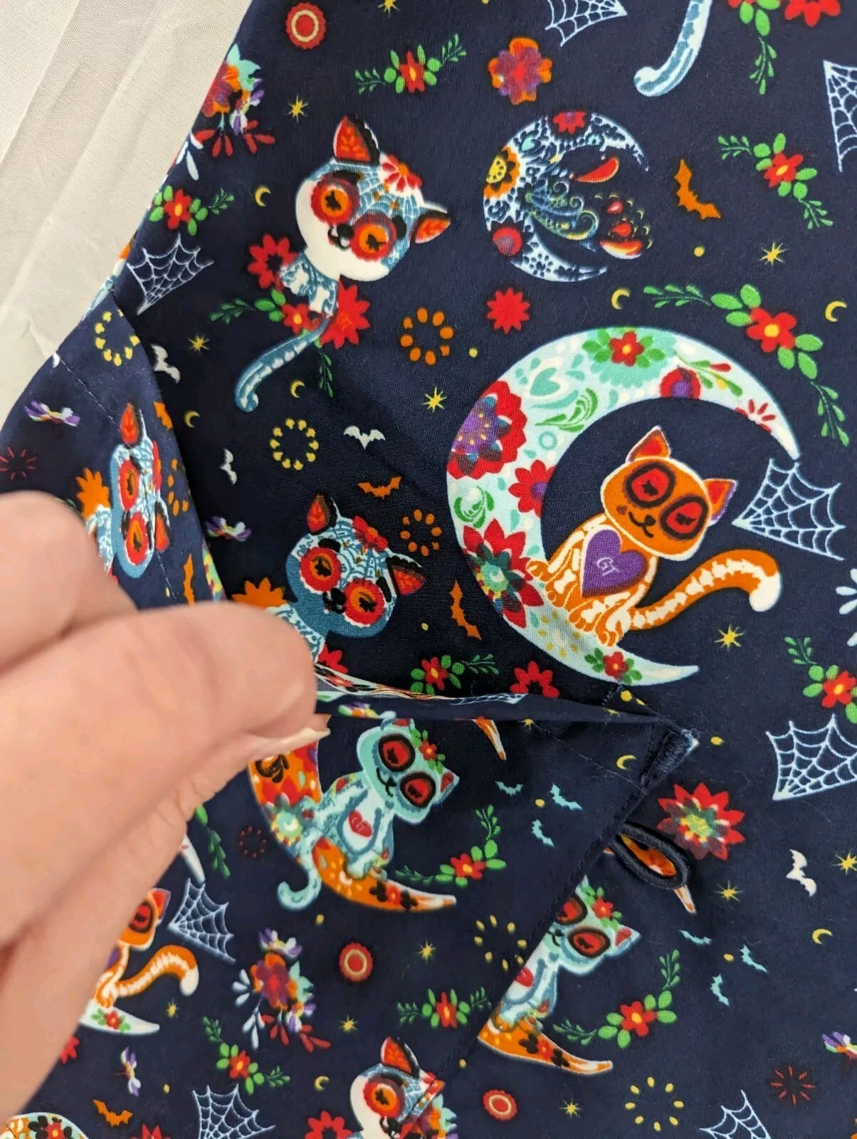 как выглядит Serene Uniforms Navy Blue Colorful Cats And Moons Scrub Top Size Small фото