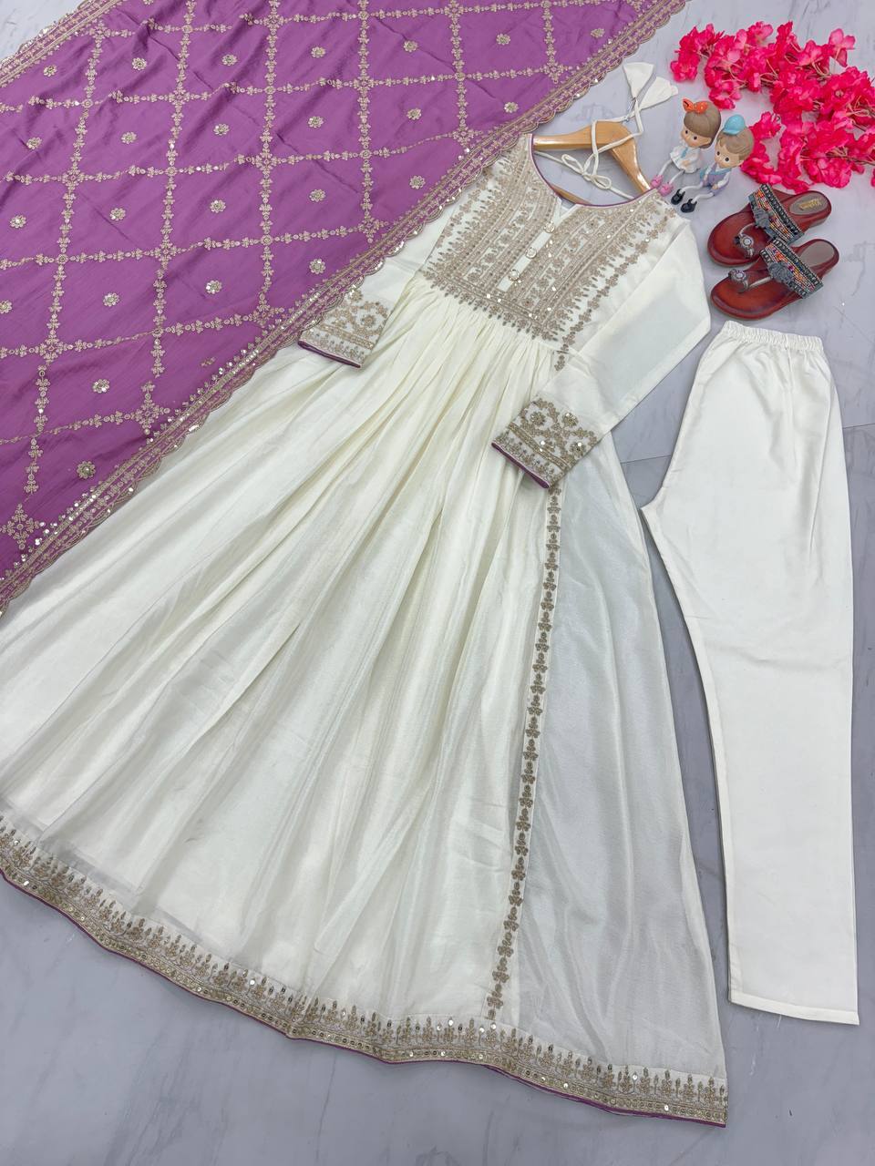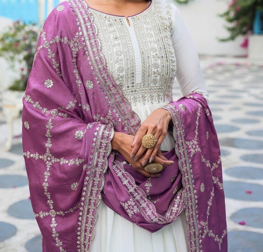 как выглядит NEW BOLLYWOOD LOOK CHINNON SILK GOWN WITH PURPLE DUPATTA FOR WOMEN WEAR фото