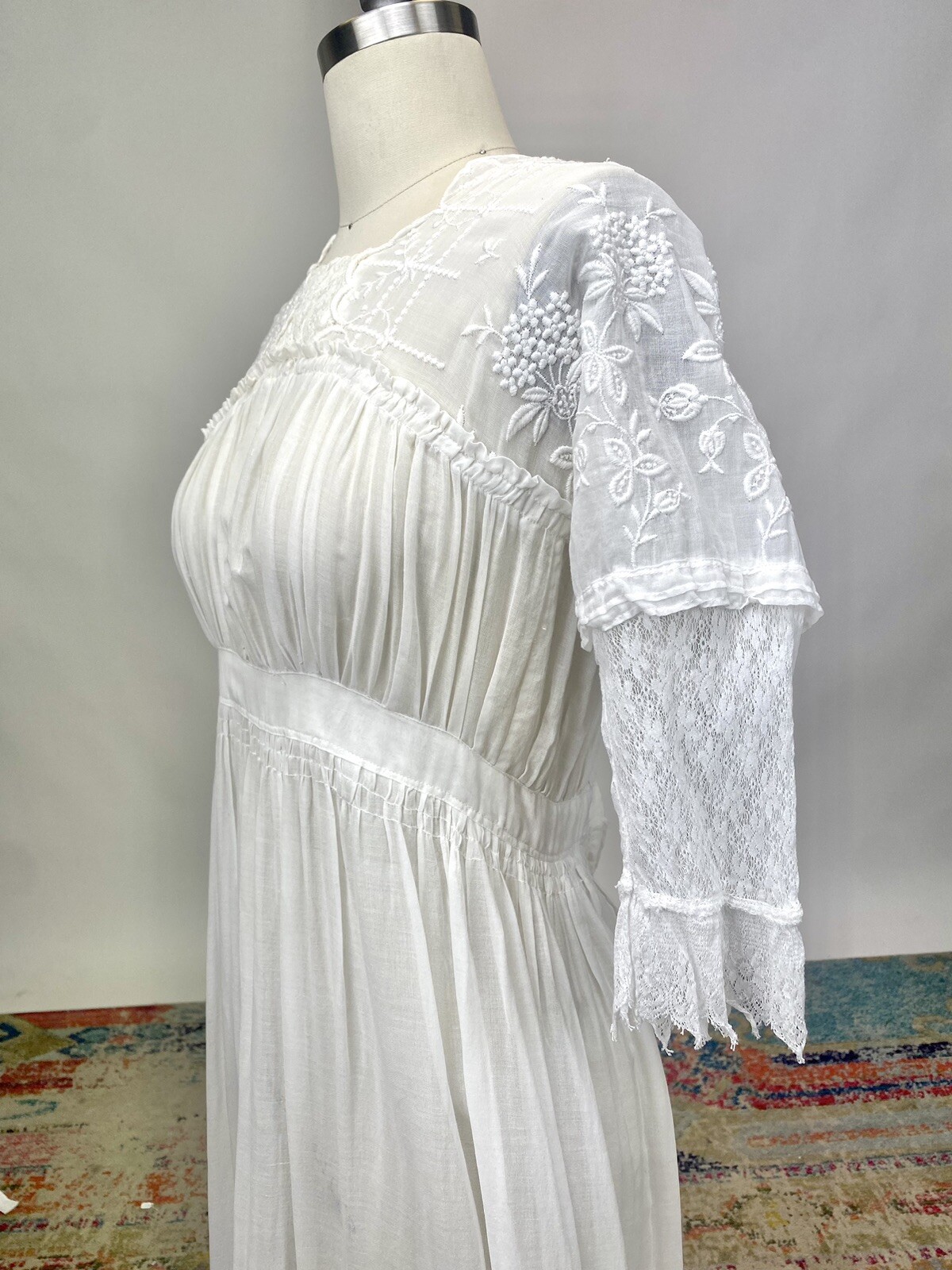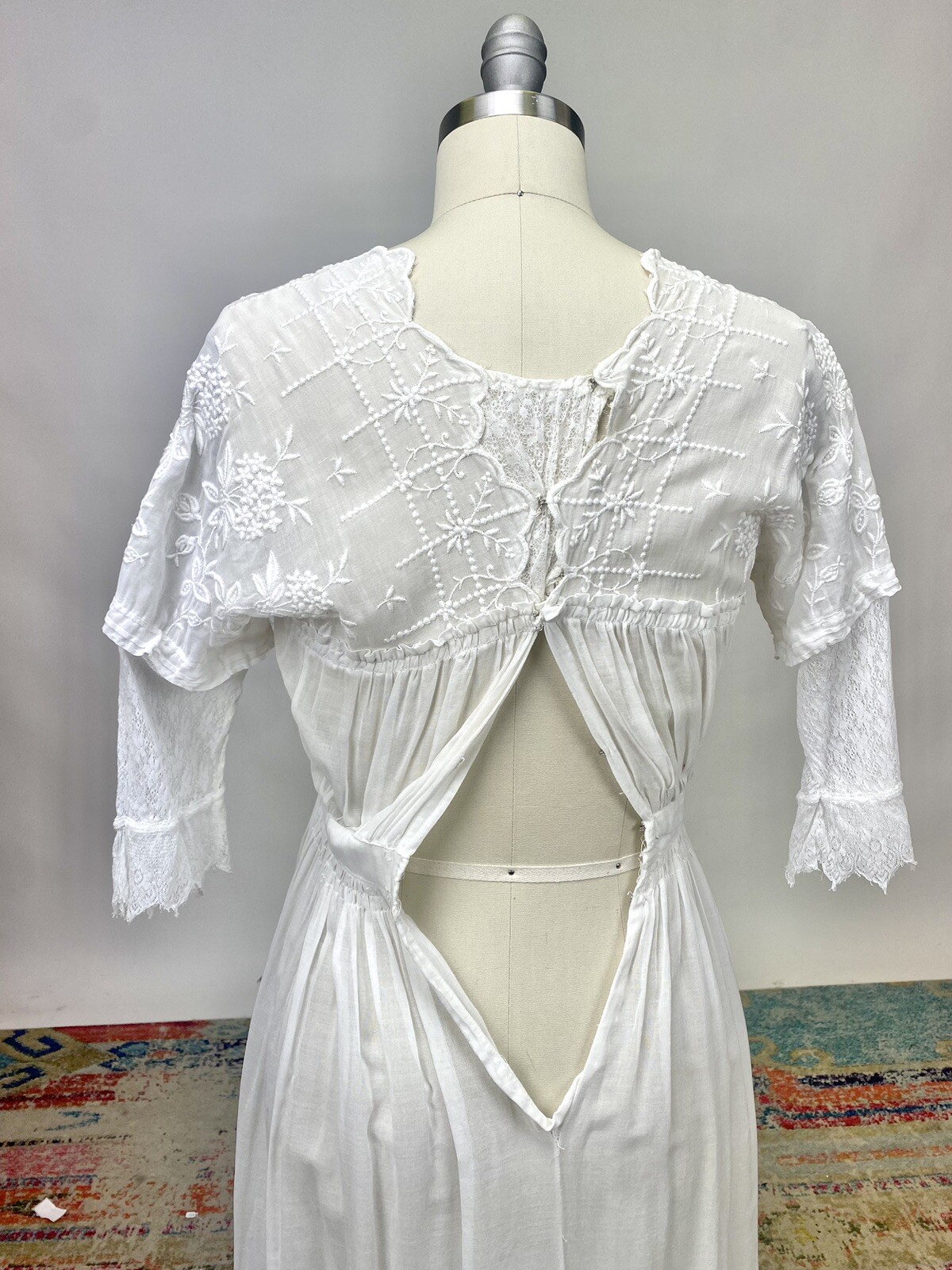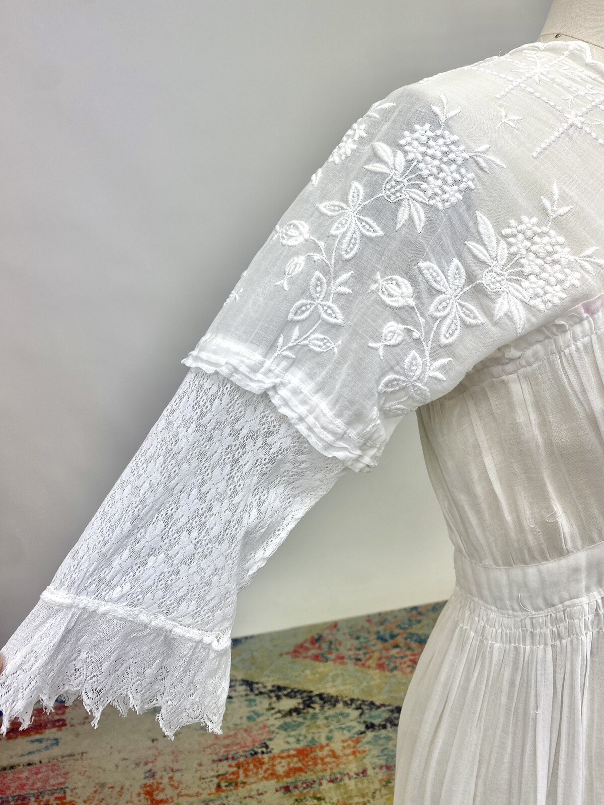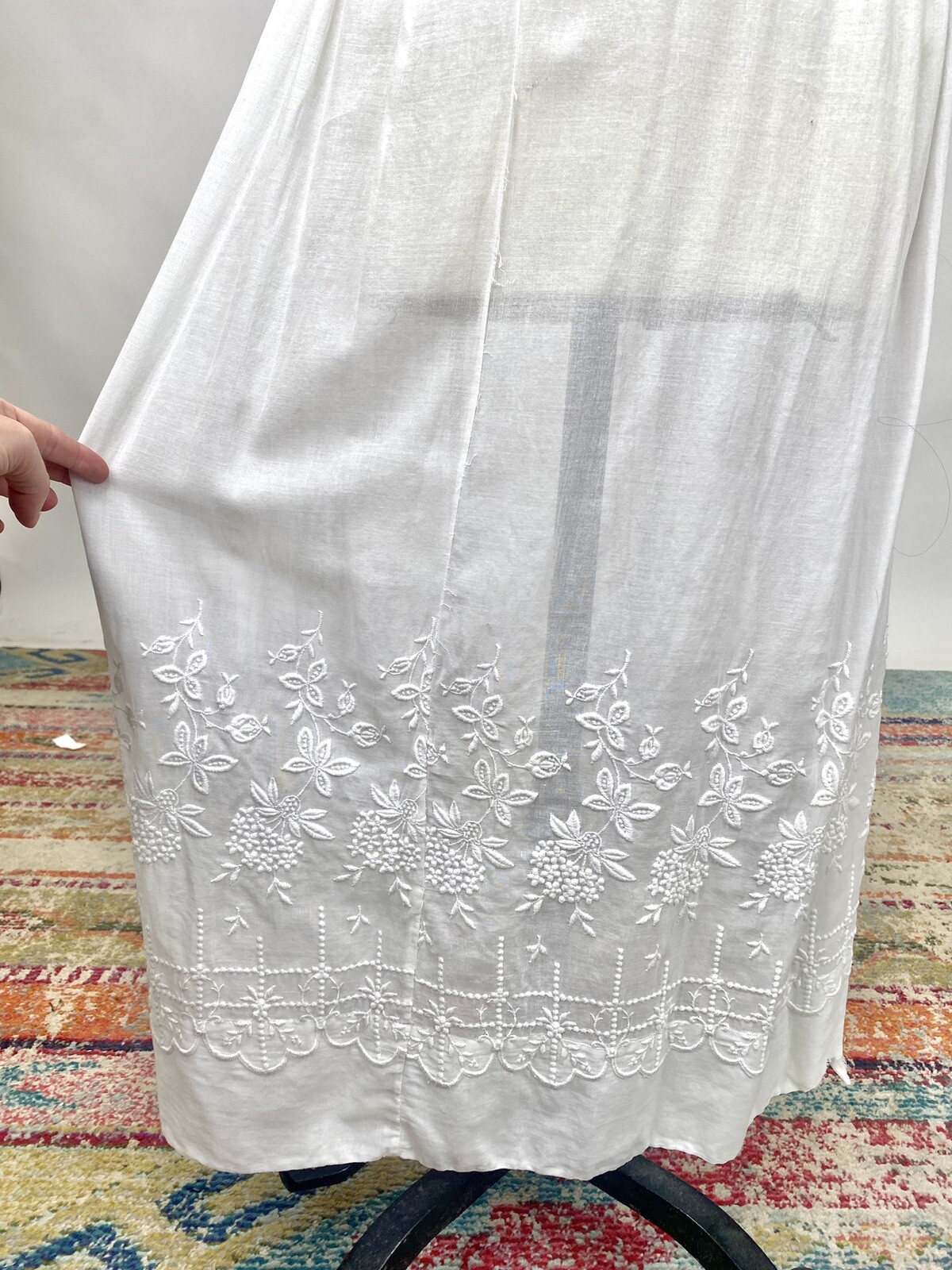 Antique Victorian Edwardian White Cotton Tea Dress Floral Embroidery Lace As is