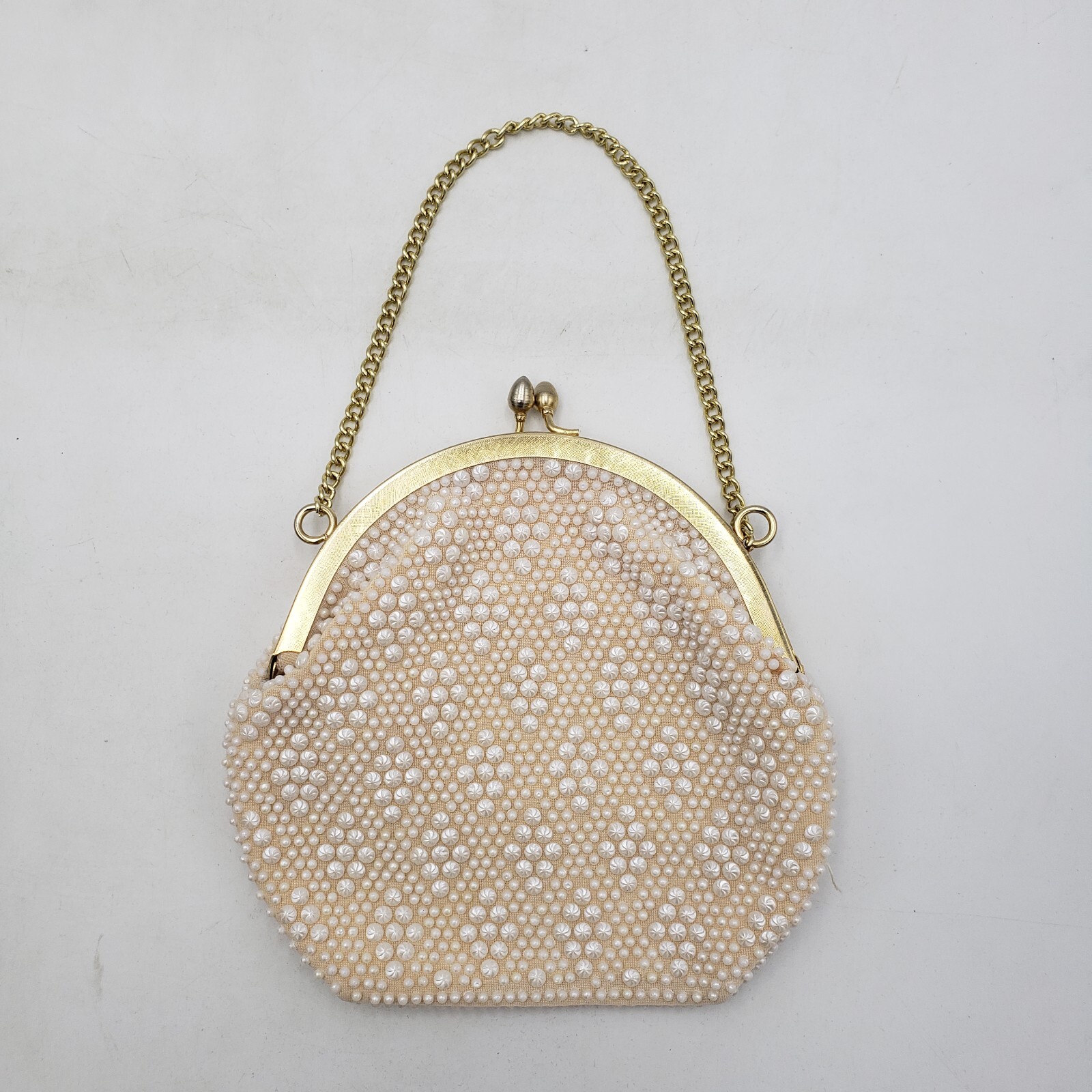Vintage Faux Pearl White Purse w/ Metal Closure Diamond Pattern Hong Kong