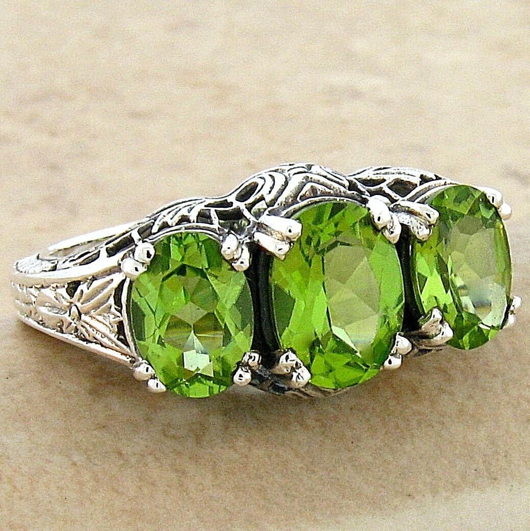 ART DECO STYLE GENUINE PERIDOT 3 STONE 925 STERLING SILVER FILIGREE RING 370