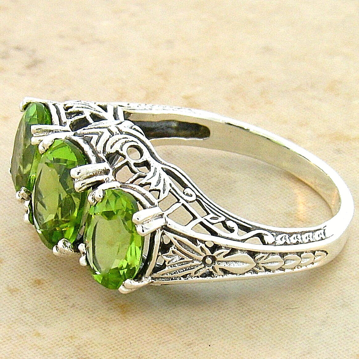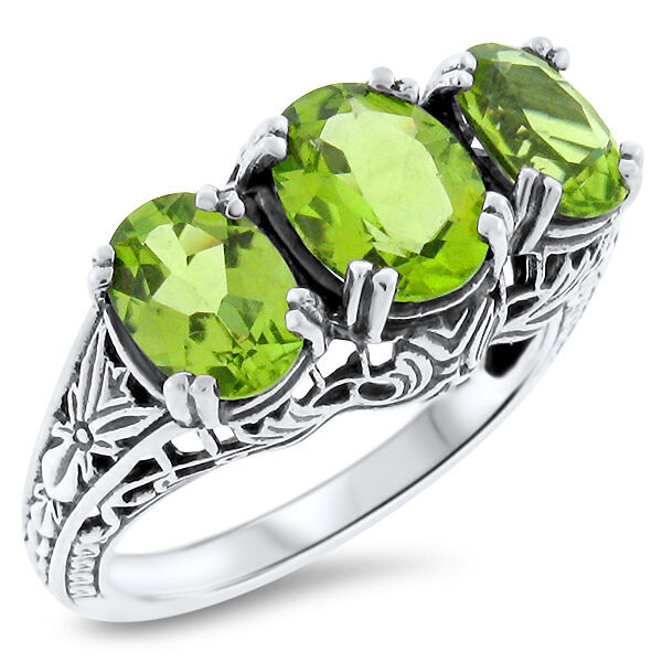 как выглядит ART DECO STYLE GENUINE PERIDOT 3 STONE 925 STERLING SILVER FILIGREE RING  370 фото