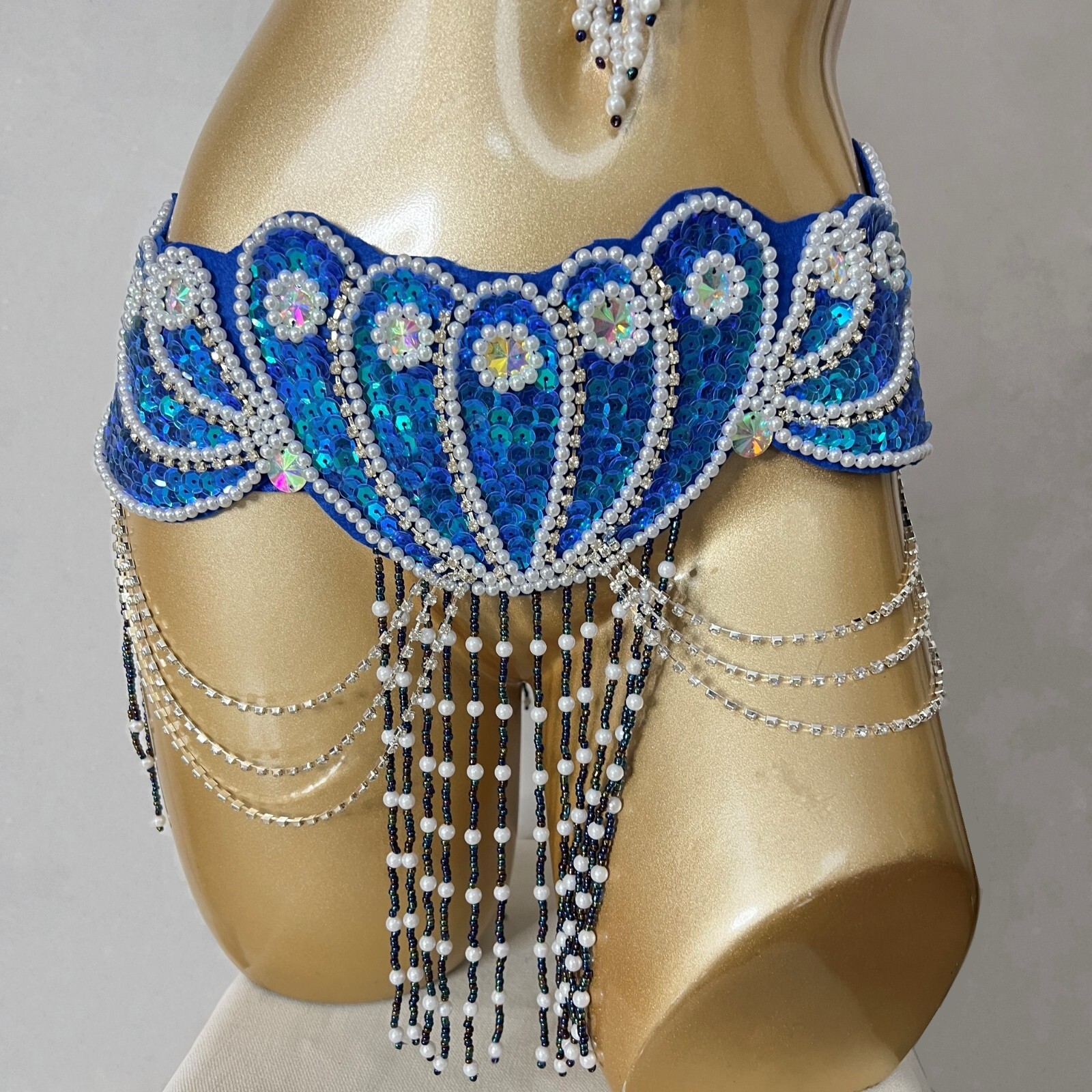 Sequins Beaded Belly Dance Costume Samba Rave EDC Carnival Outfit Bra Belt Blue