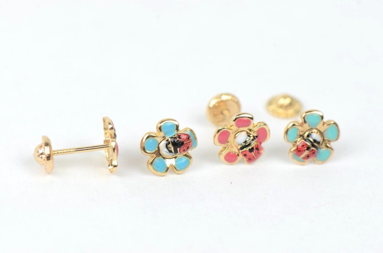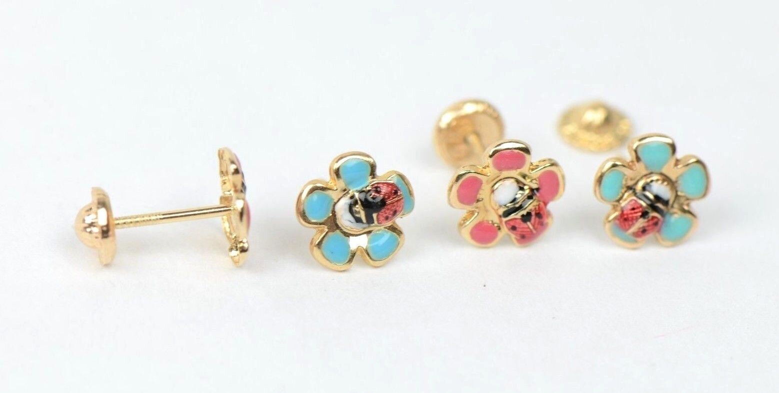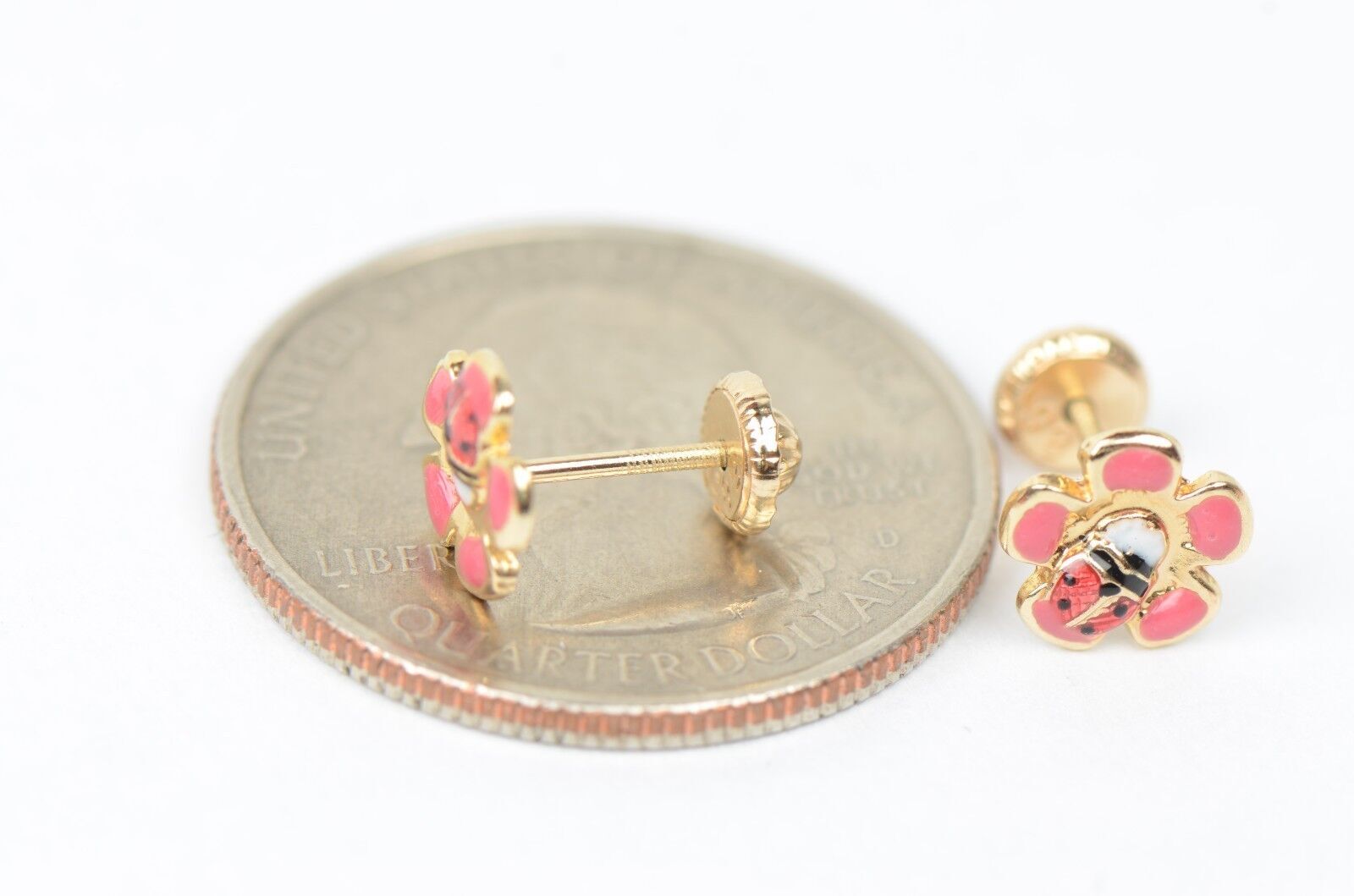 14k Yellow Gold Baby Enamel Flower earrings, Screw Back