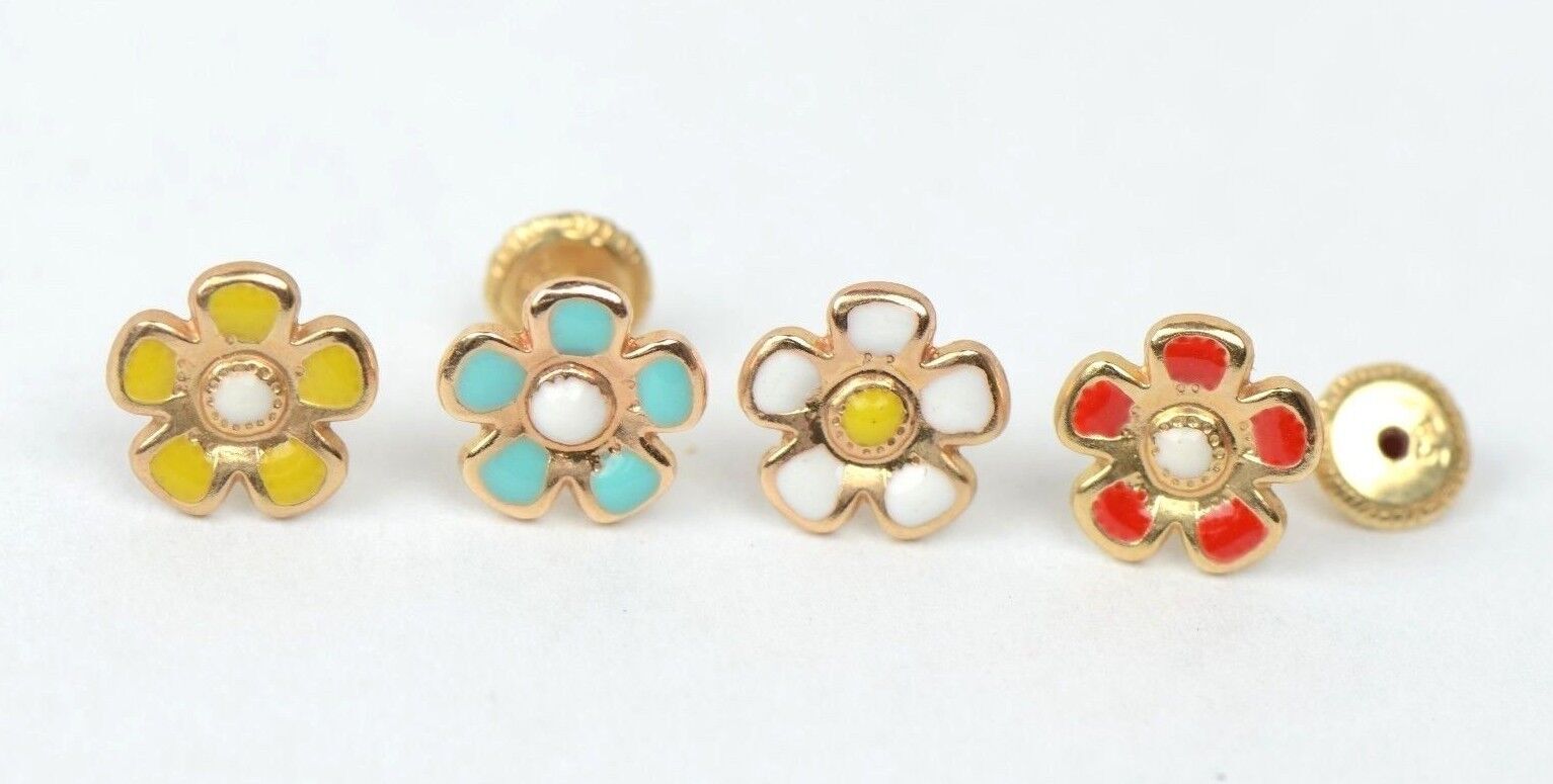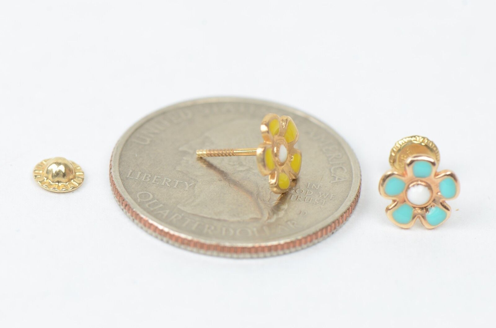 14k Yellow Gold Baby Enamel Flower earrings, Screw Back