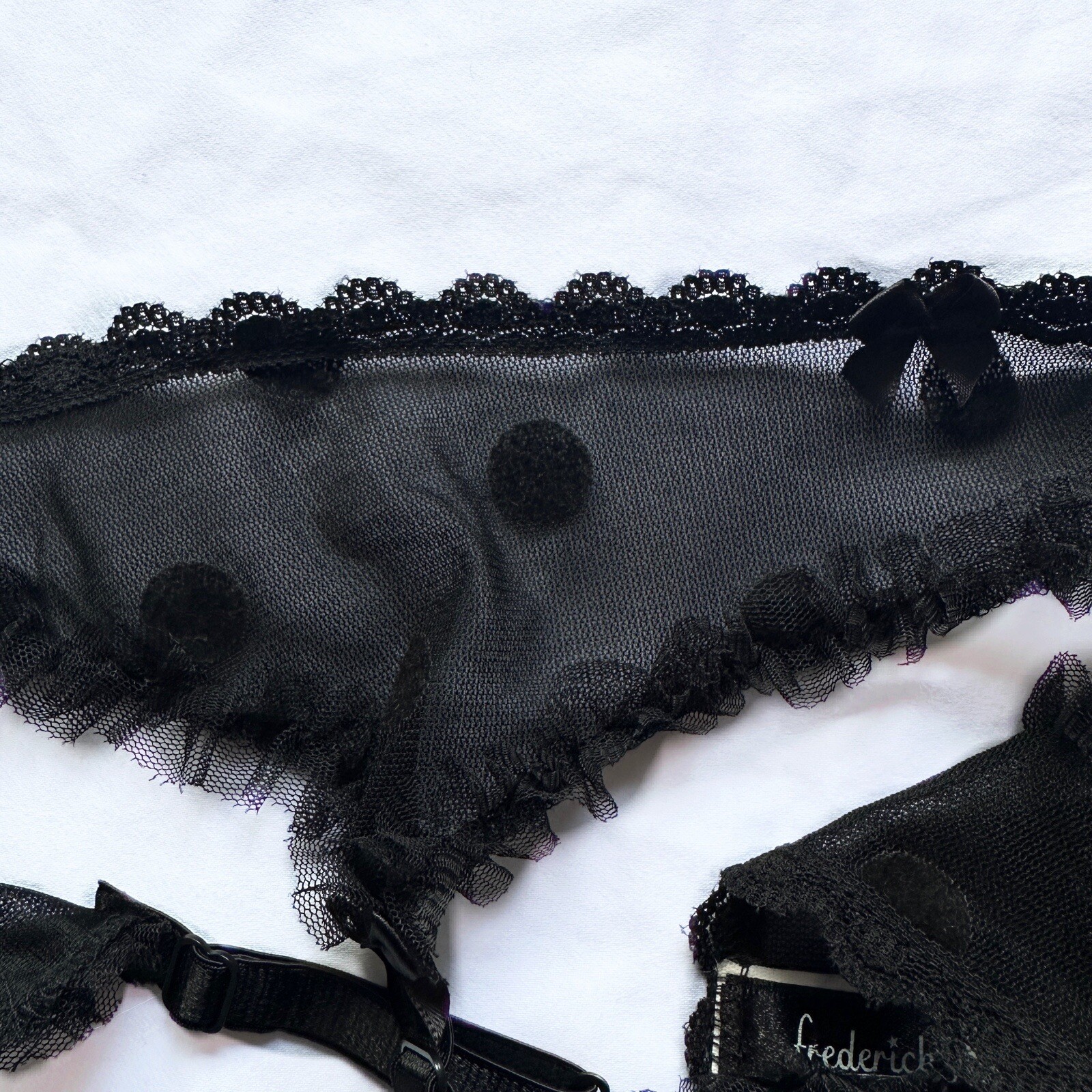 как выглядит Frederick s Of Hollywood Vintage Black Sheer Polka Dot Ruffle Mesh Garter Belt фото