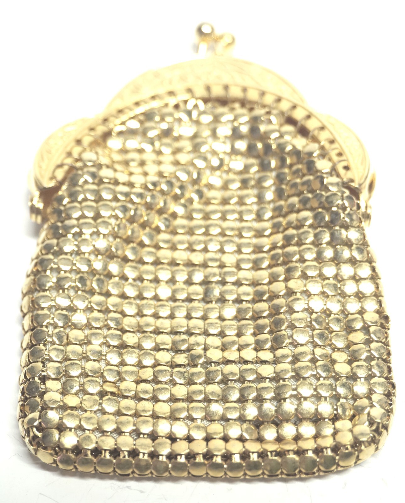 как выглядит Vintage Mesh Metal Gold Tone Coin Purse- Kiss Clasp w/Floral Frame- Lined фото