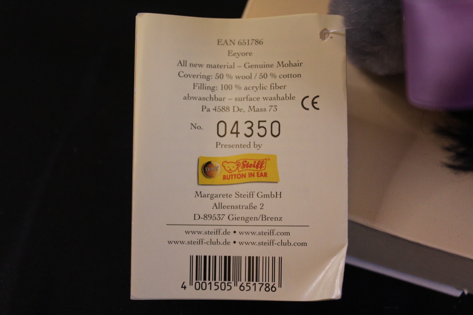Limited Edition Steiff 2001 Winnie The Pooh "Eeyore" Stuffed Animal