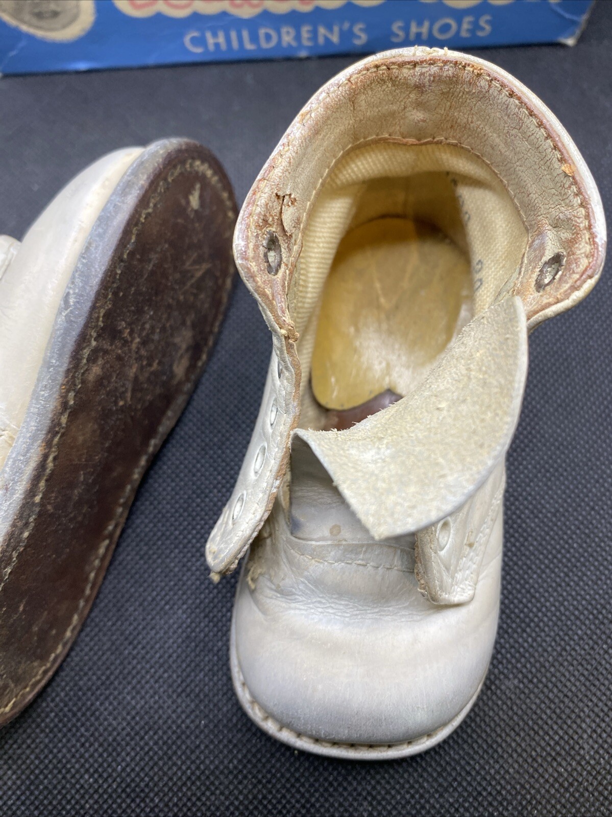 как выглядит VTG Childs Shoes White Leather Flat bottom Toddler Baby Lace Up Zellers Box фото