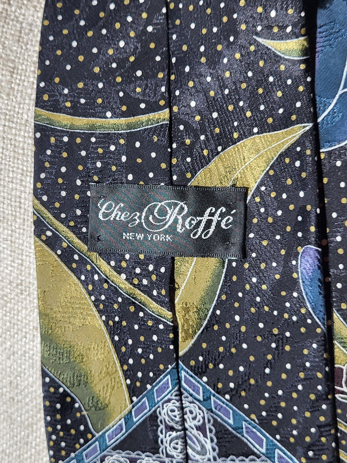 как выглядит Vtg Chez Roffe Luxury Tie Black Blue Printed Silk Necktie 56" x 4" фото