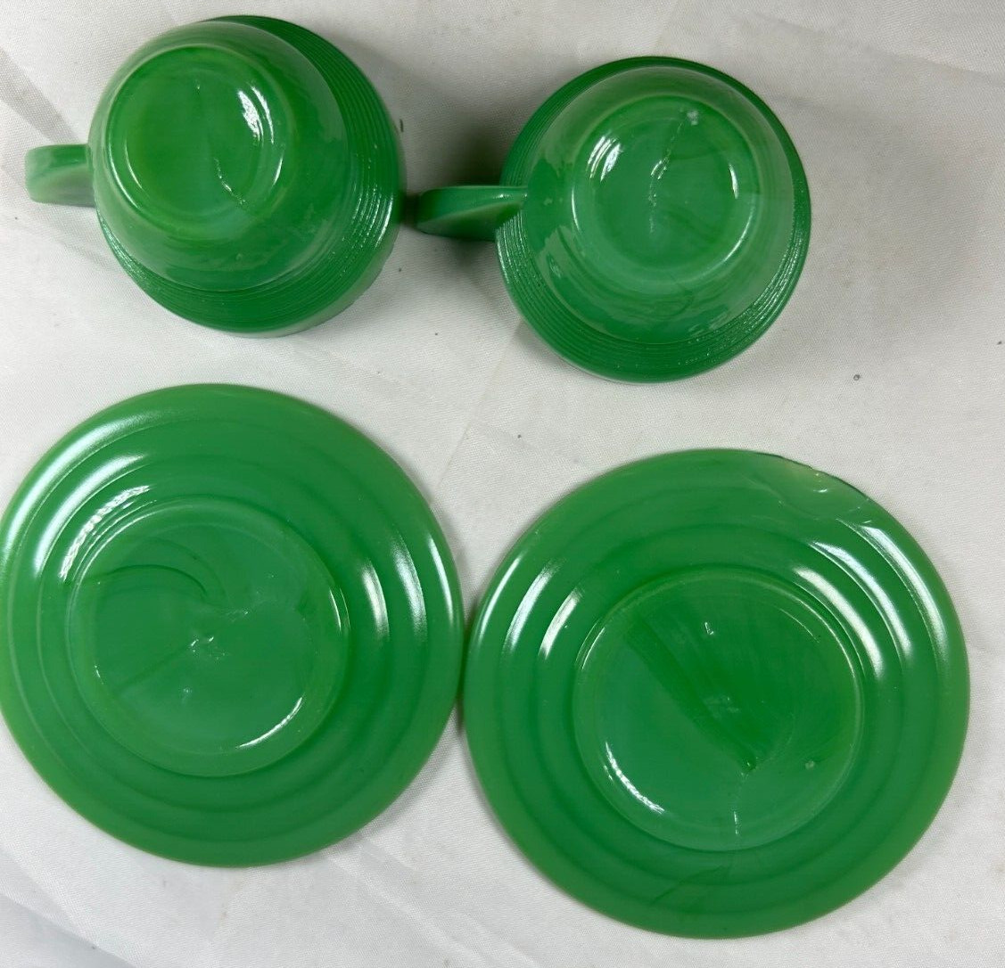 2 Vntg Akro Agate Green Concentric Ring/Rib Jadeite Milk Glass Teacup Saucer