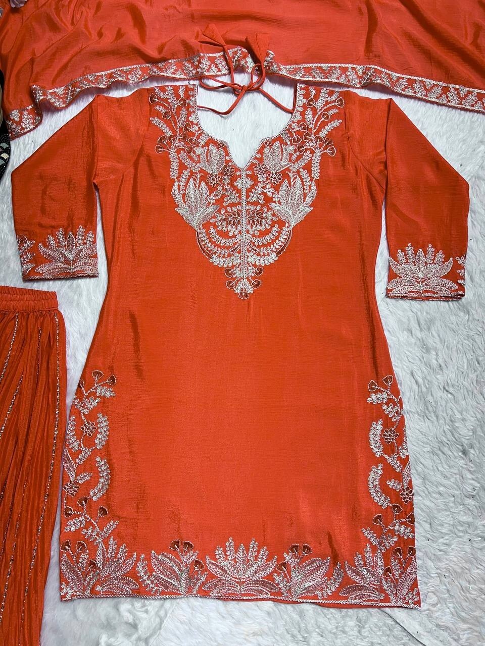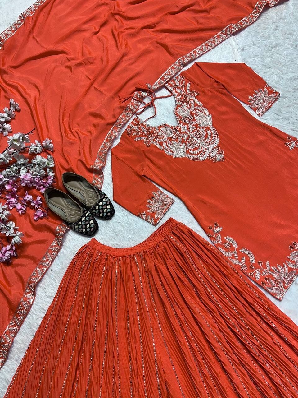 как выглядит New Collection Orange Chinon Silk Top Palazzo With Dupatta For Women фото