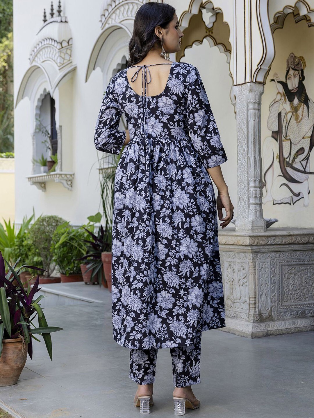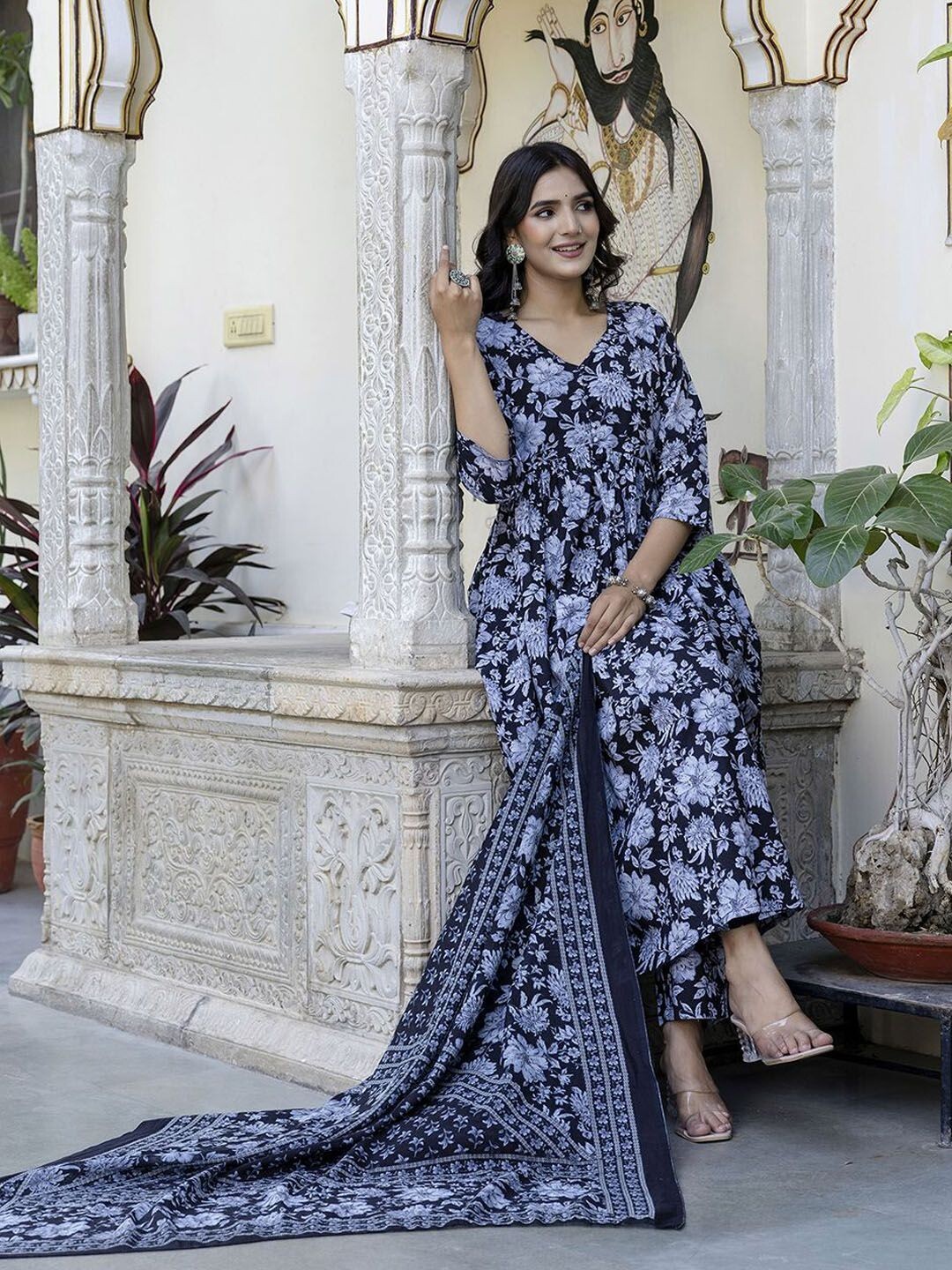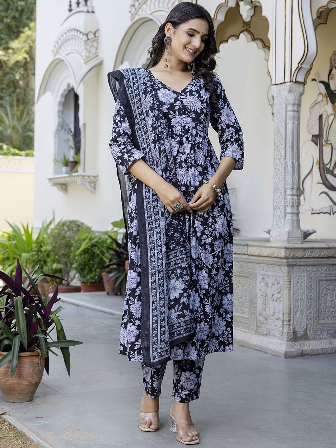Indian Women Black Cotton Floral Printed Anarkali Kurta With Trouser Dupatta