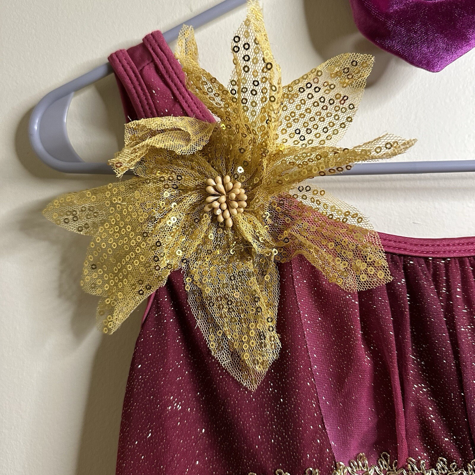 как выглядит Curtain Call Burgundy/Gold Sparkle Dance Costume Elegant Flowing Design Size AM фото