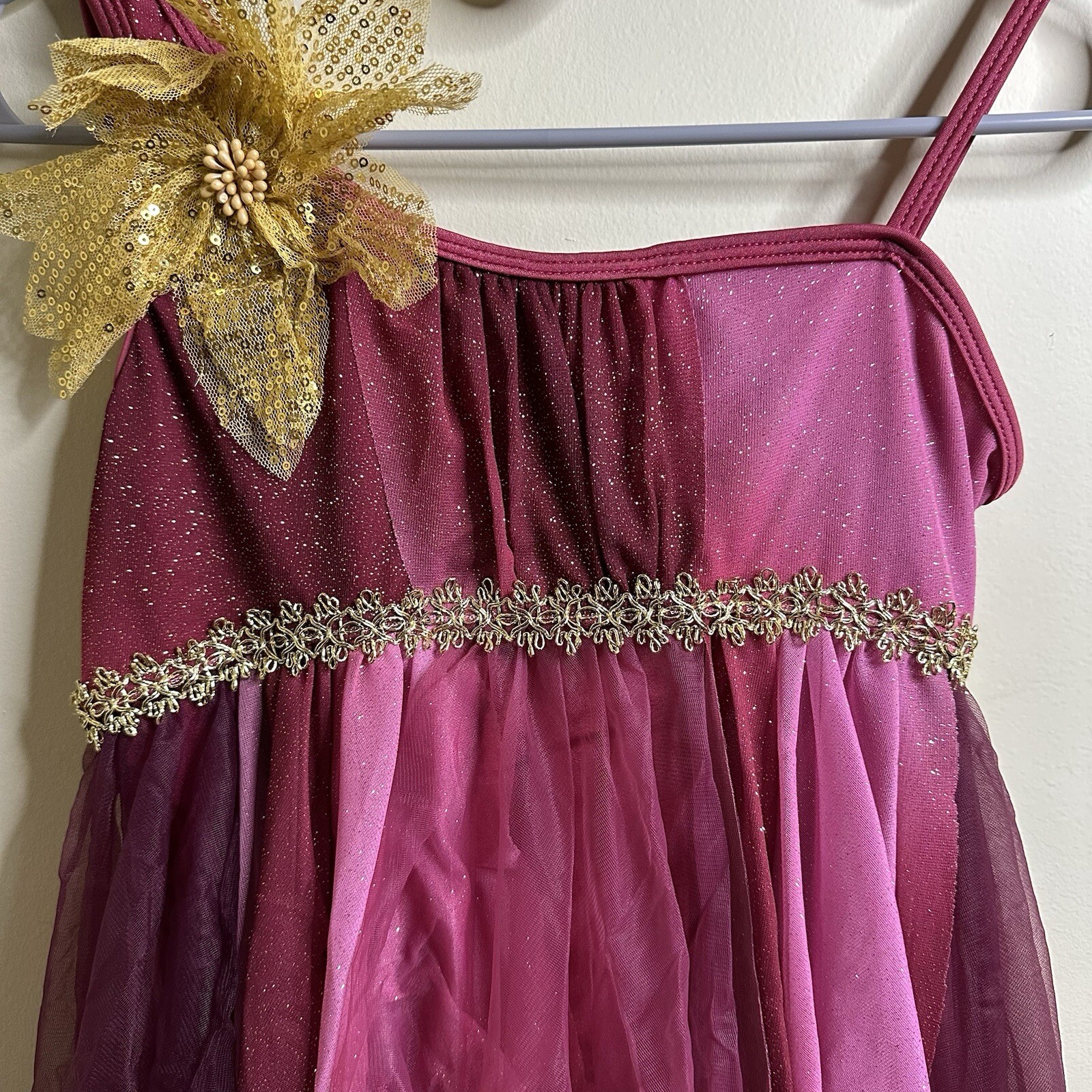 Curtain Call Burgundy/Gold Sparkle Dance Costume Elegant Flowing Design Size AM
