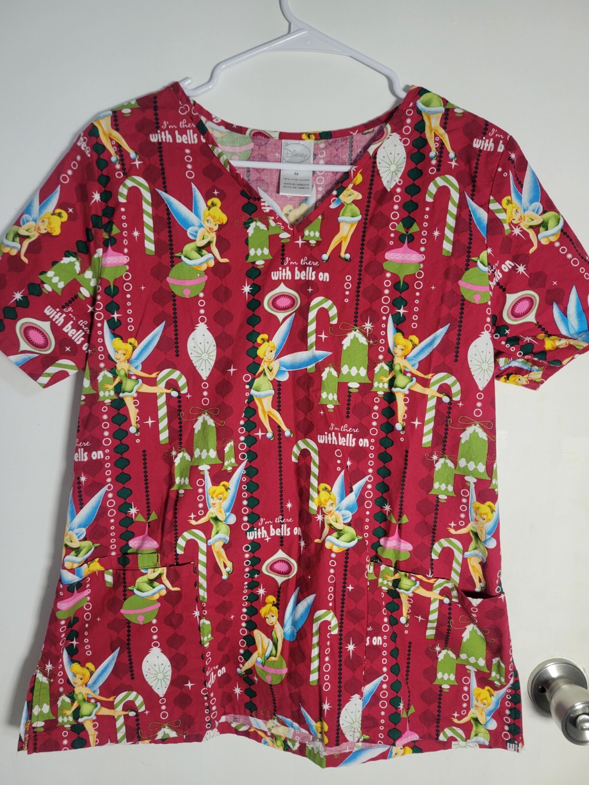 как выглядит Disney Scrub Top Womans Medium Red Christmas Tinkerbell Print V-Neck фото