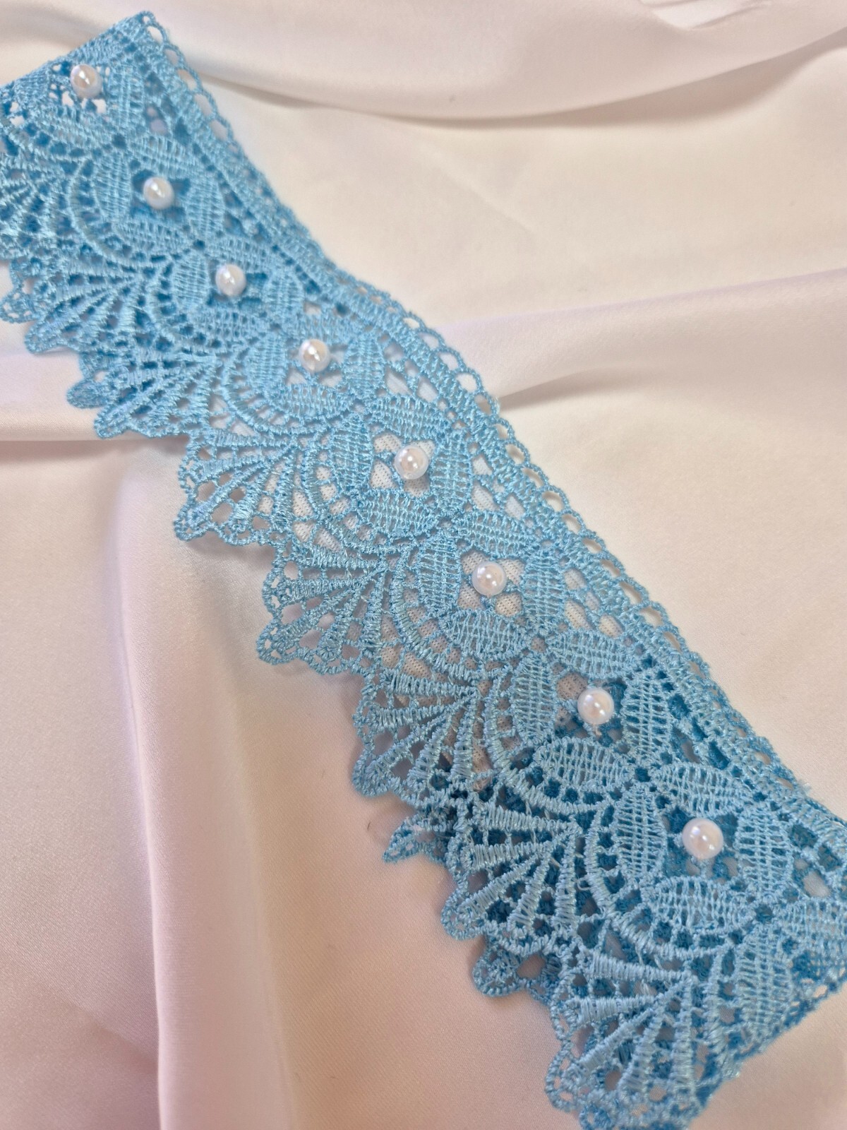Blue wedding garter lace decorated with white beads, handmade