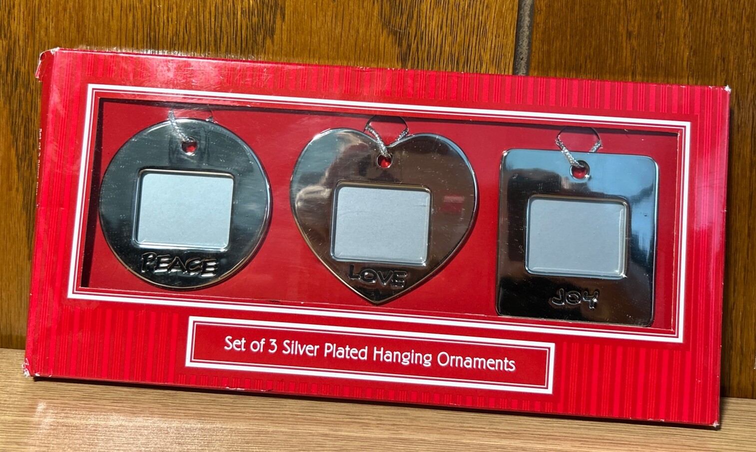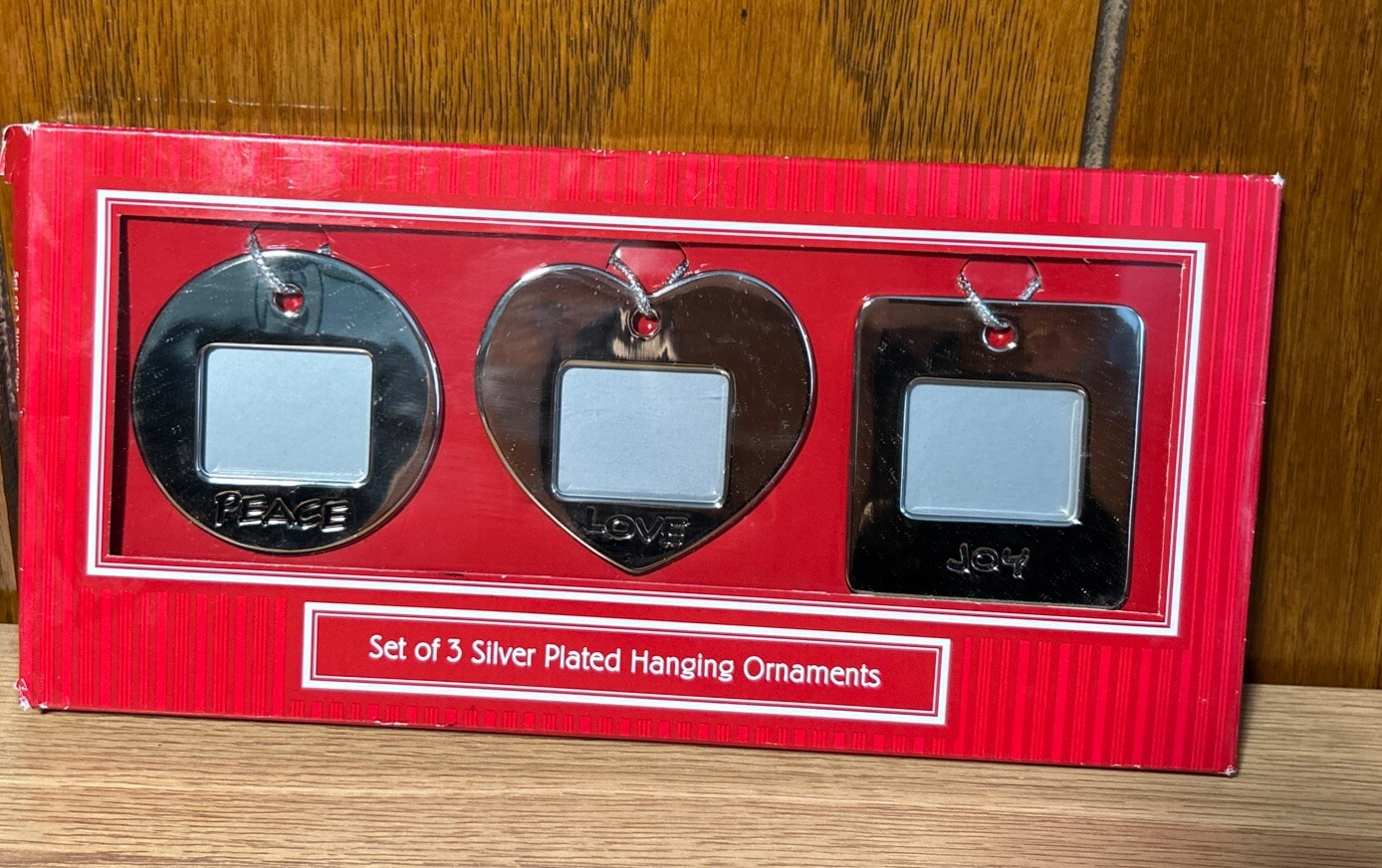 • Sulver Plated Peace Love Joy Christmas Ornaments Set Of 3 NIB Round Heart Square