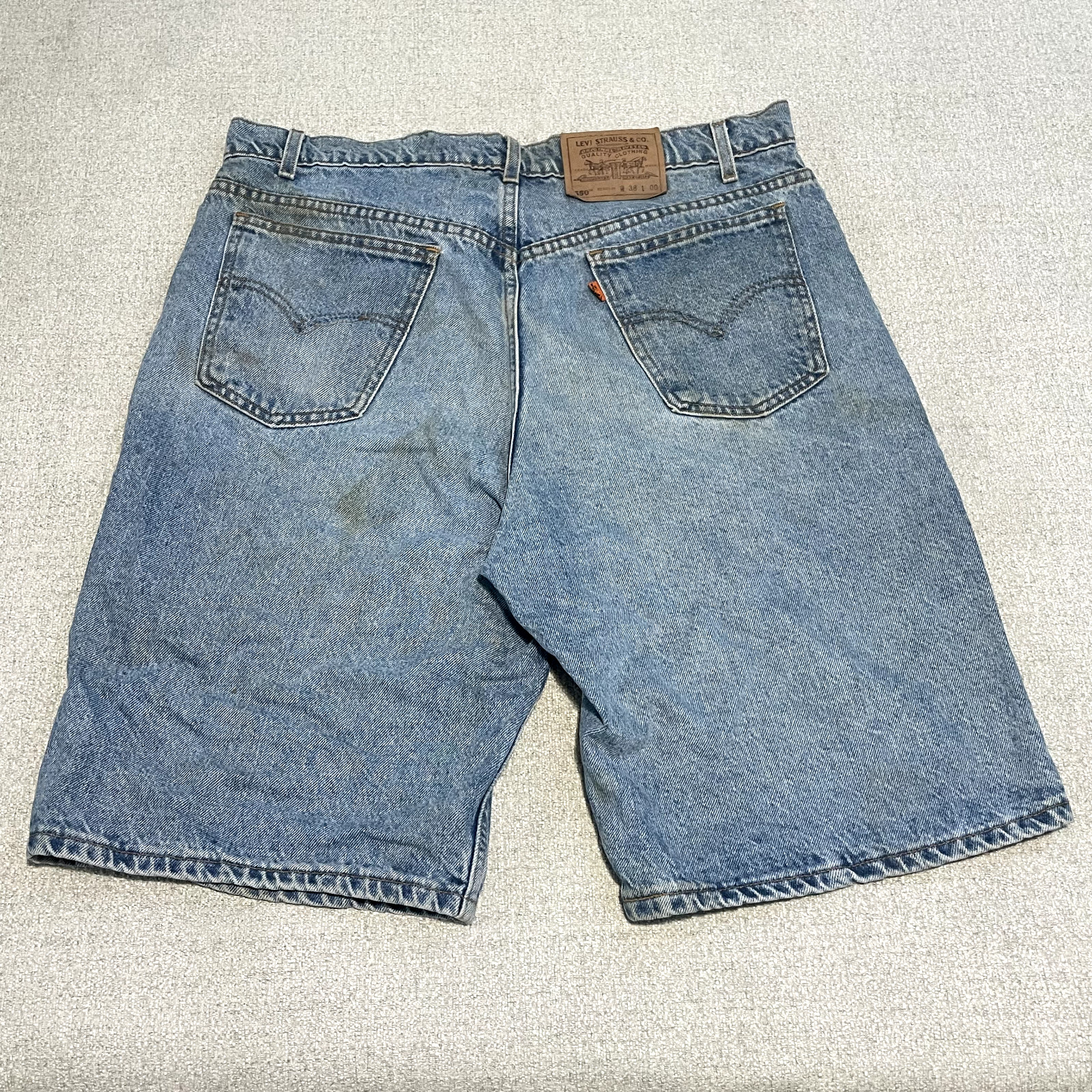 Vintage Levi's 550 Relax Fit Orange Tab Denim Shorts Men's 38 Blue - STAINED