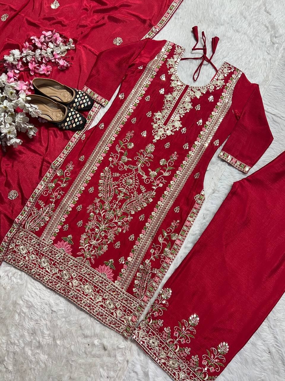Stylish Look Chinnon Silk Palazzo Suit With Red Dupatta For Reception Wear