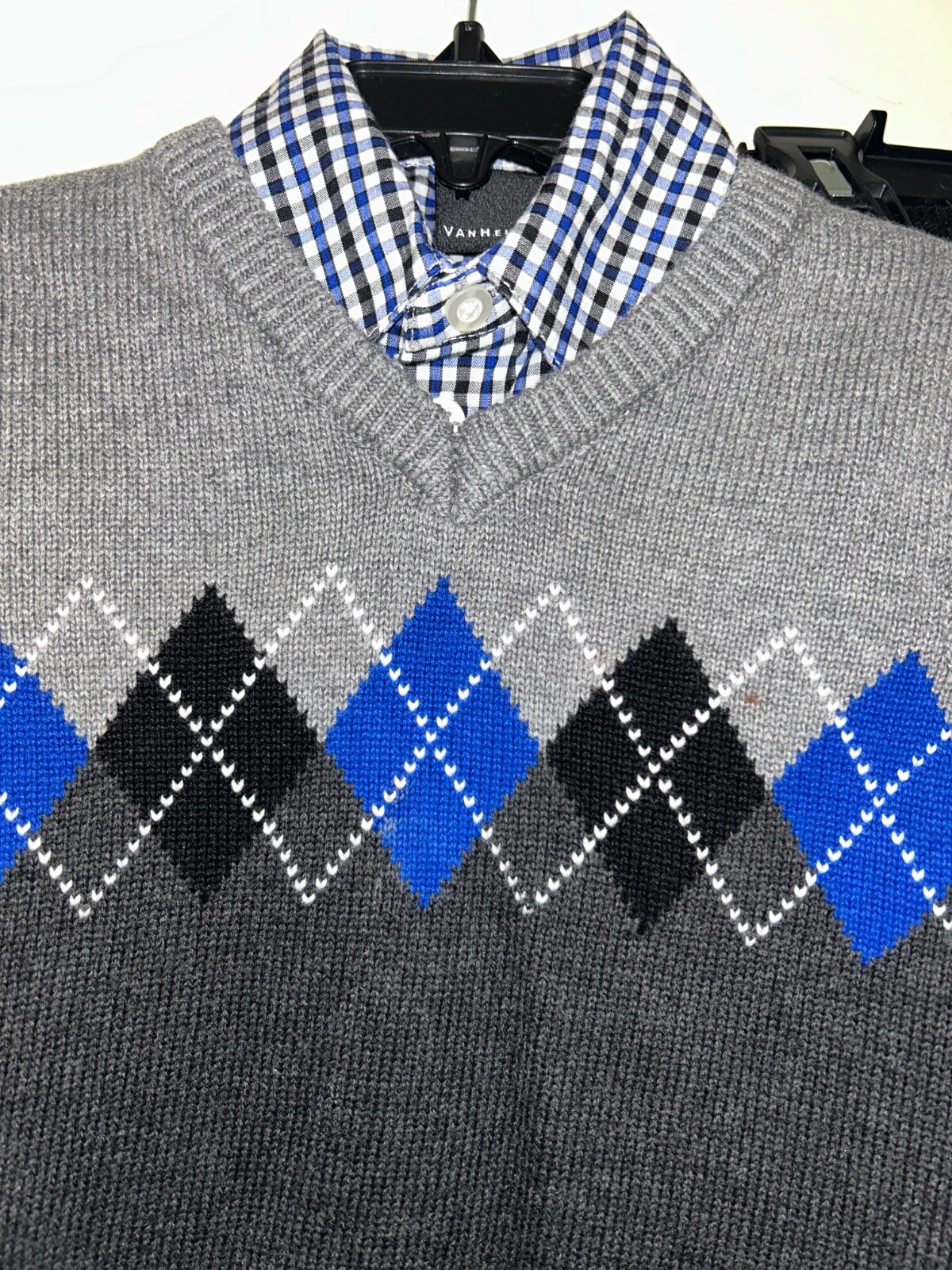 как выглядит Van Heusen Boys Dress Shirt Sweater Pants Set Blue Gray Black Check Size 5 EUC фото