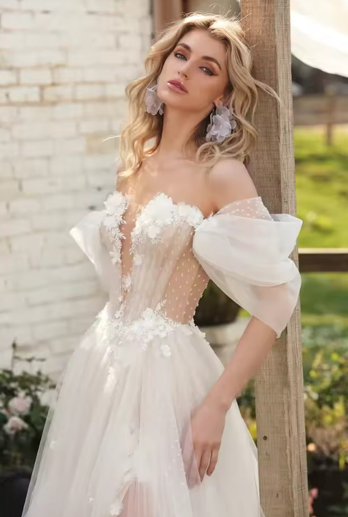 как выглядит Boho Off The Shoulder V-Neck 3d Flower A-Line Wedding Dresses Side Slit Tulle фото