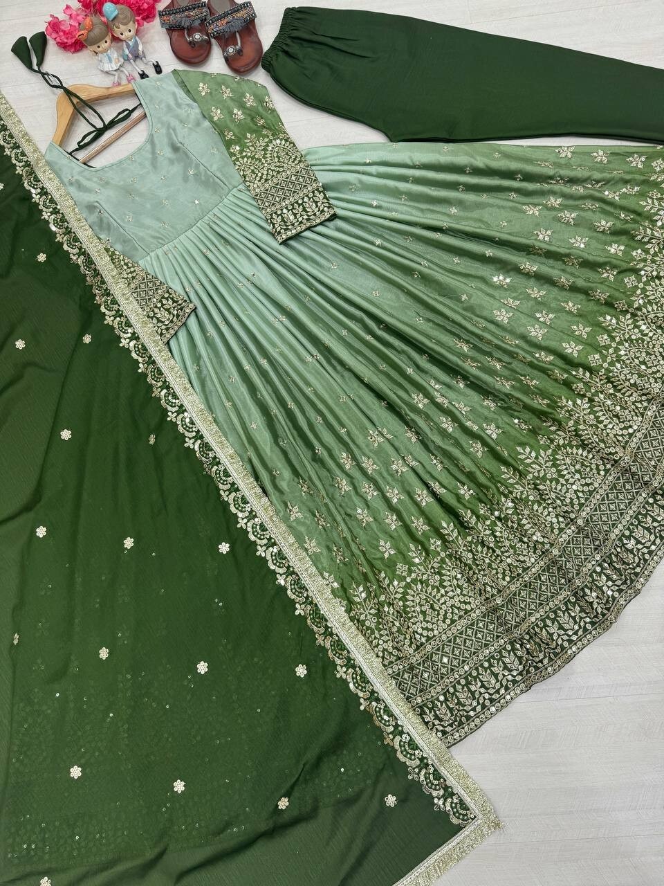 Reception Wear Chinnon Silk Green Salwar Kameez With Dupatta For Women Girls