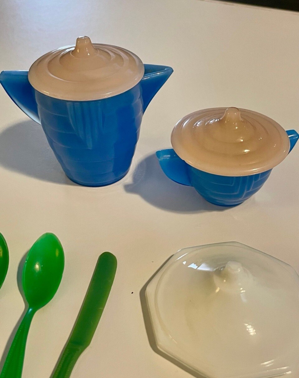 как выглядит Vintage Akro Agate 31 pc CHILDs PLAY-TIME Jadeite Milk Glass Tea Set Dishes фото