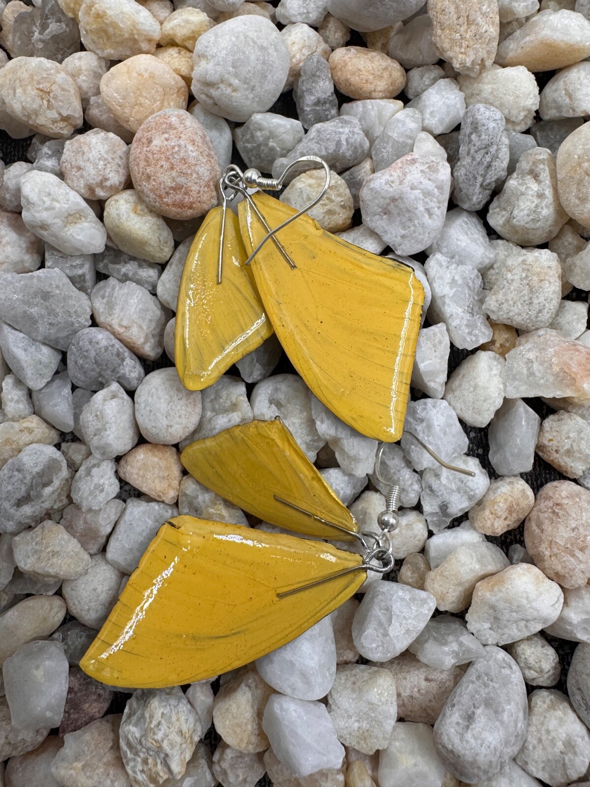 Hand Painted Resin Dipped Dual Butterfly Wing Leaf Earings - Yellow Black