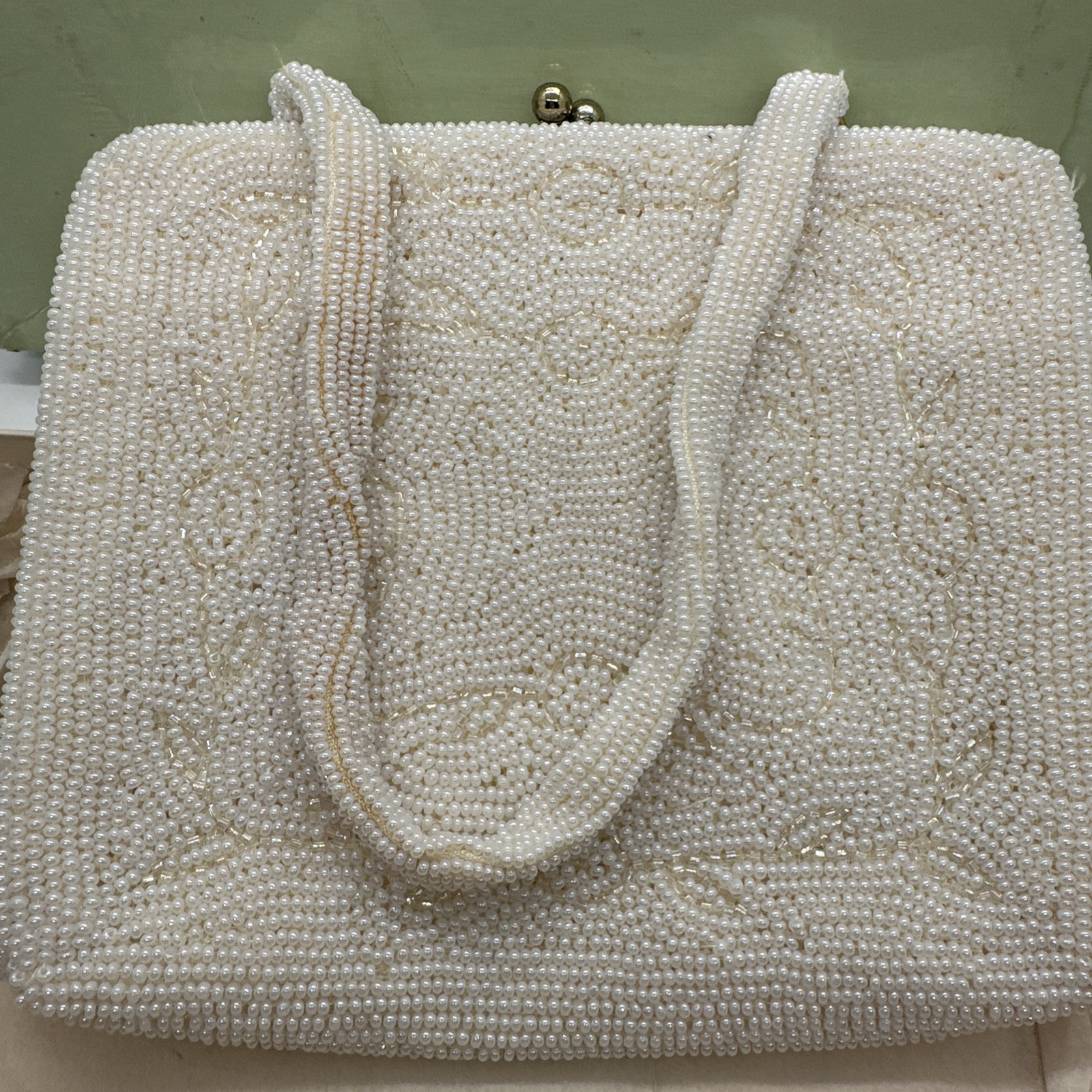 как выглядит Vintage Evening Bag/Clutch Hand Made in Japan Ivory Pearly Beads Age Discoloring фото