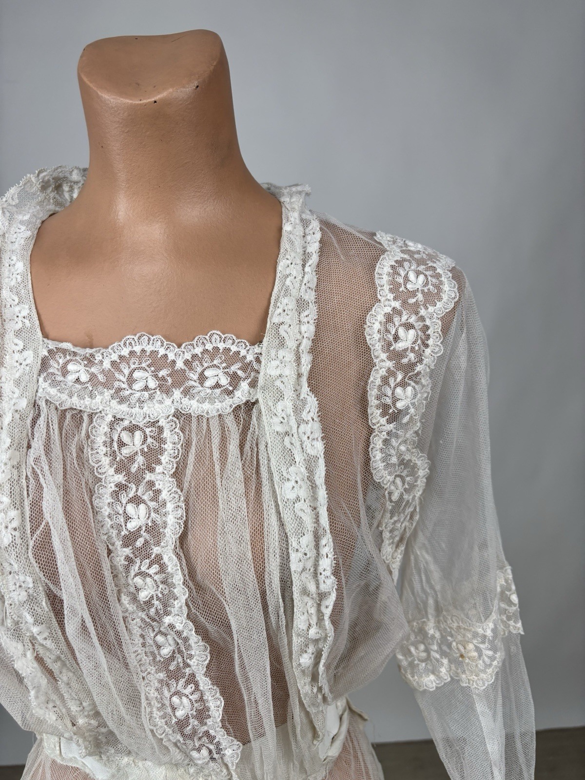 как выглядит Antique Edwardian 1910s White Net Lace Day Dress Floral Lace Trim Silk AS IS фото