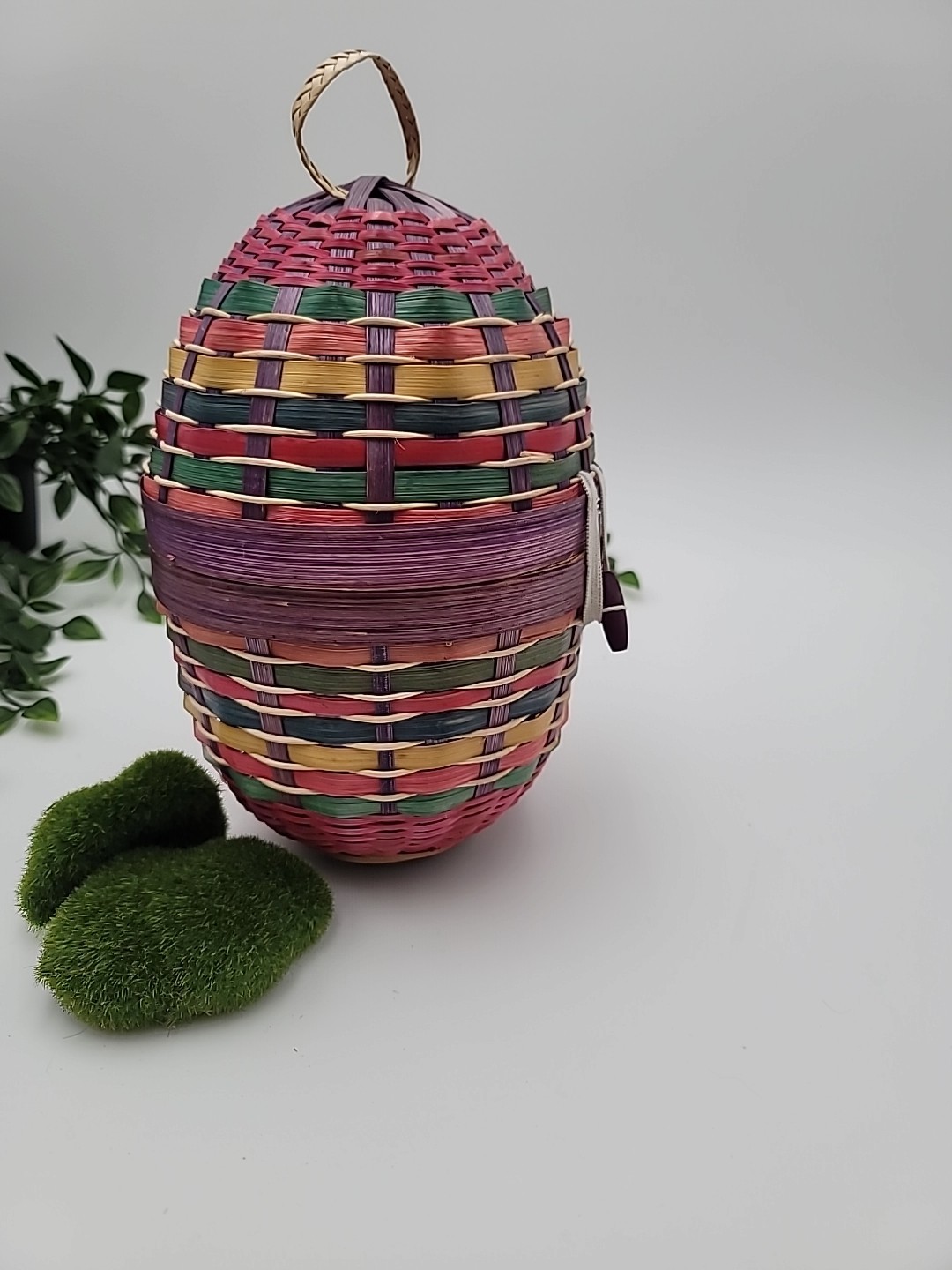 • Vtg Bright Easter Egg Shaped Woven Wicker Basket Attached Lid 11" x 8"