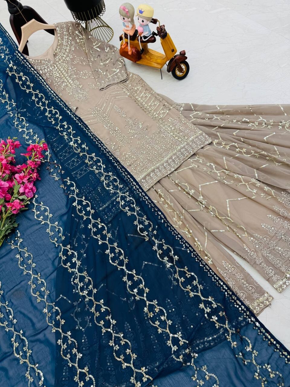 как выглядит Latest Faux Georgette Beige Top Palazzo With Blue Dupatta For Function Wear фото