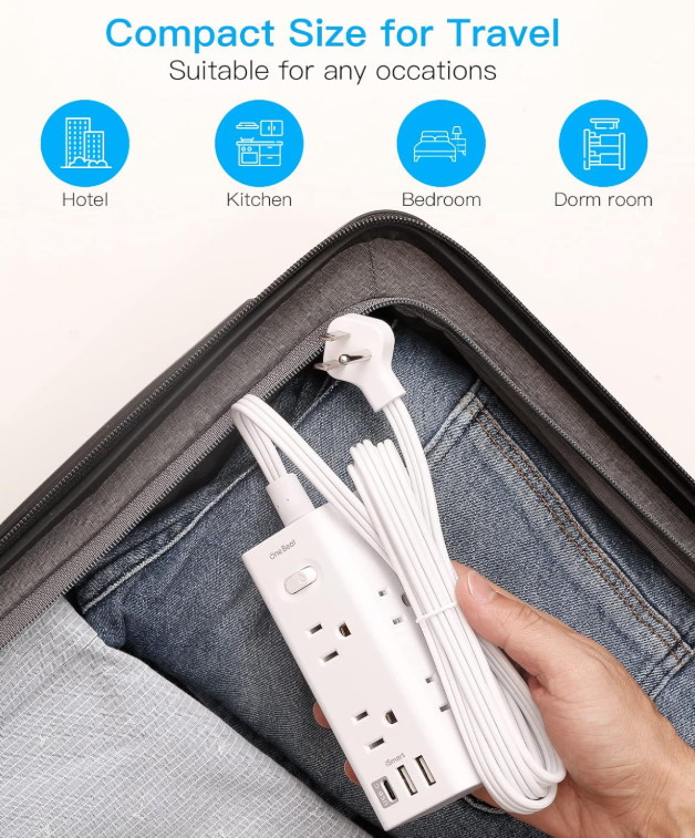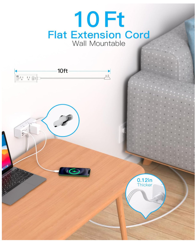 10Ft Extension Cord with Multiple Outlets, Flat Plug Power Strip Surge Protector