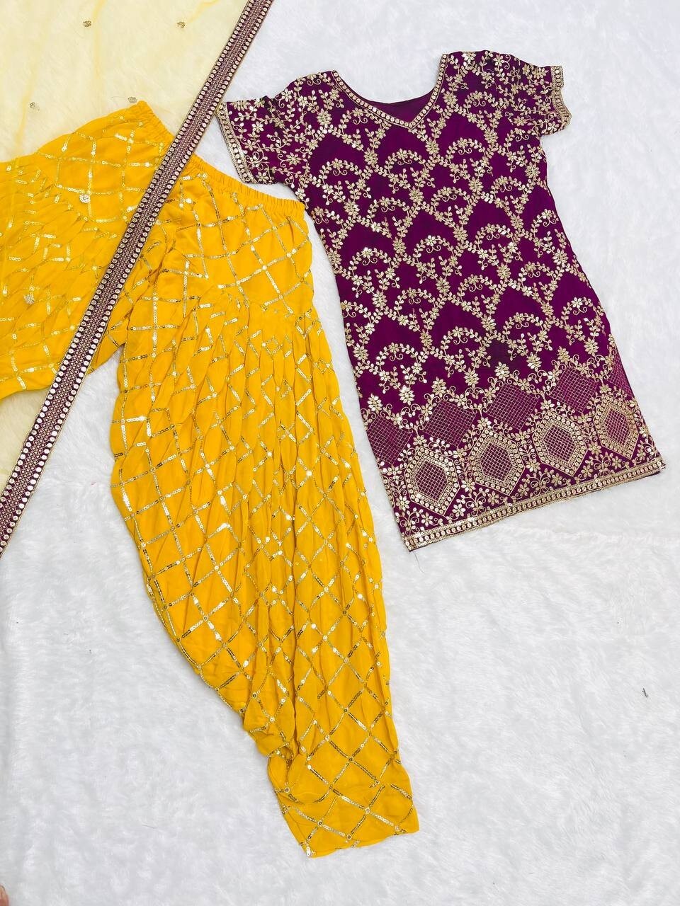 как выглядит Latest Attractive Vichitra Silk Top And Yellow Dhoti With Dupatta For Women Wear фото