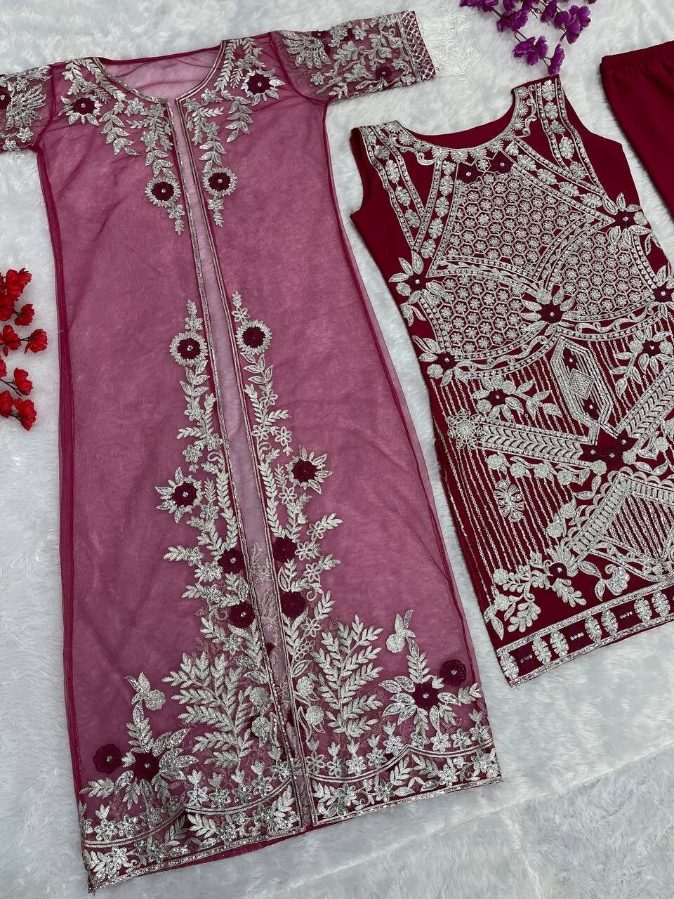 Fashionable Heavy Soft Net Maroon Salwar Kameez With Koti For Wedding Wear