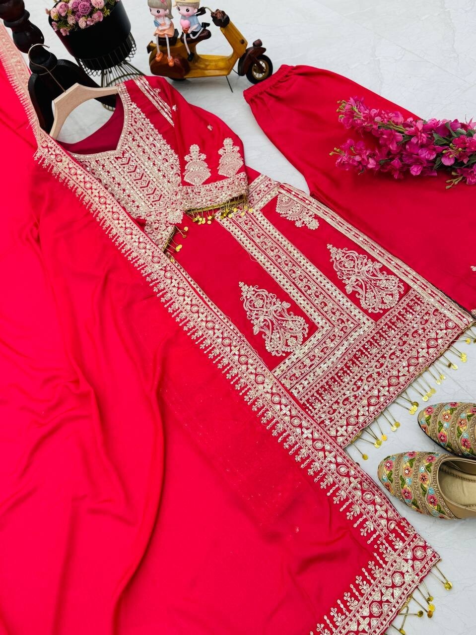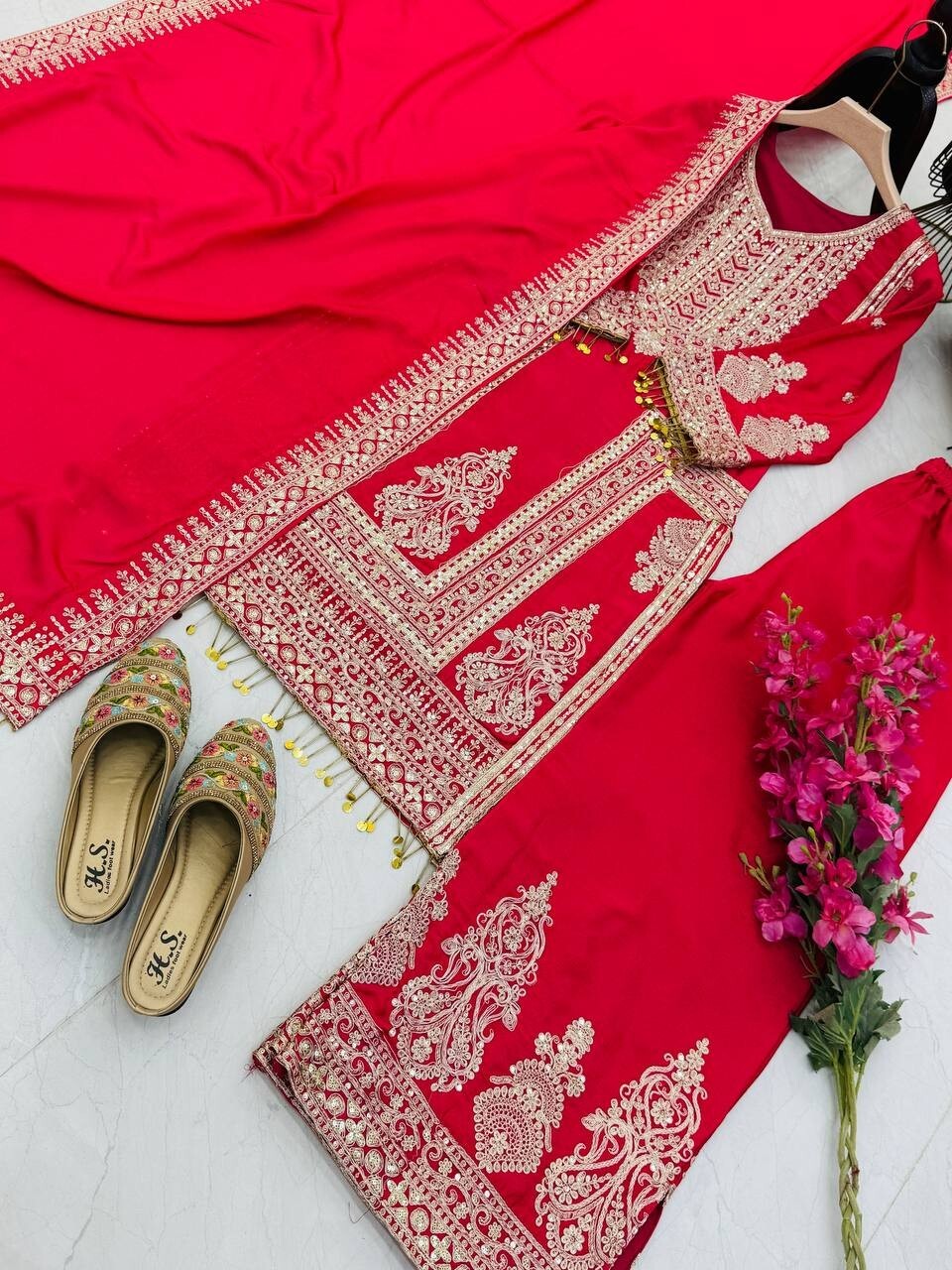 Exclusive Red Heavy Chinon Silk Palazzo Suit With Dupatta For Wedding Party