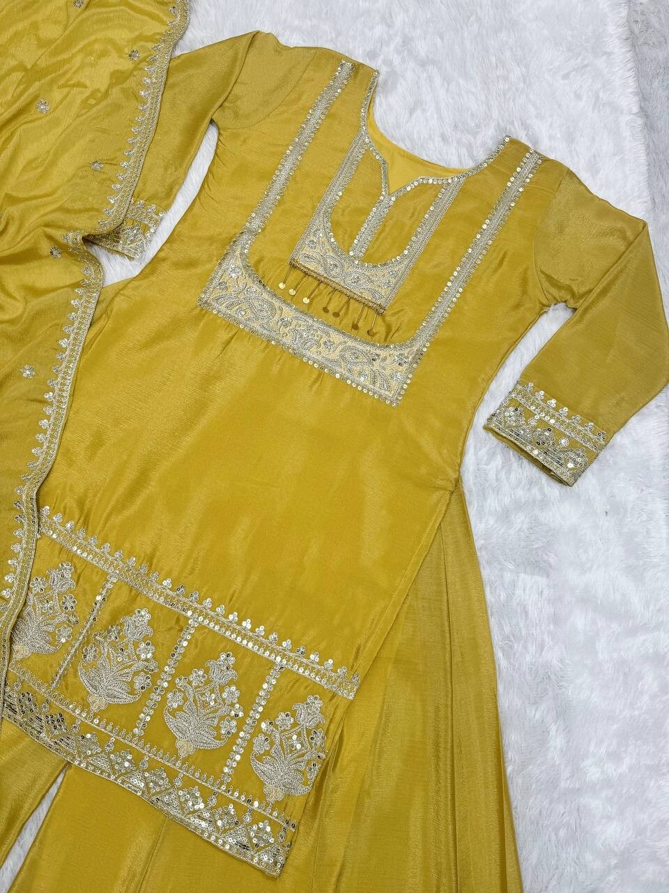 Stylish Look Chinnon Silk Yellow Palazzo Suit With Dupatta For Pakistani Wear