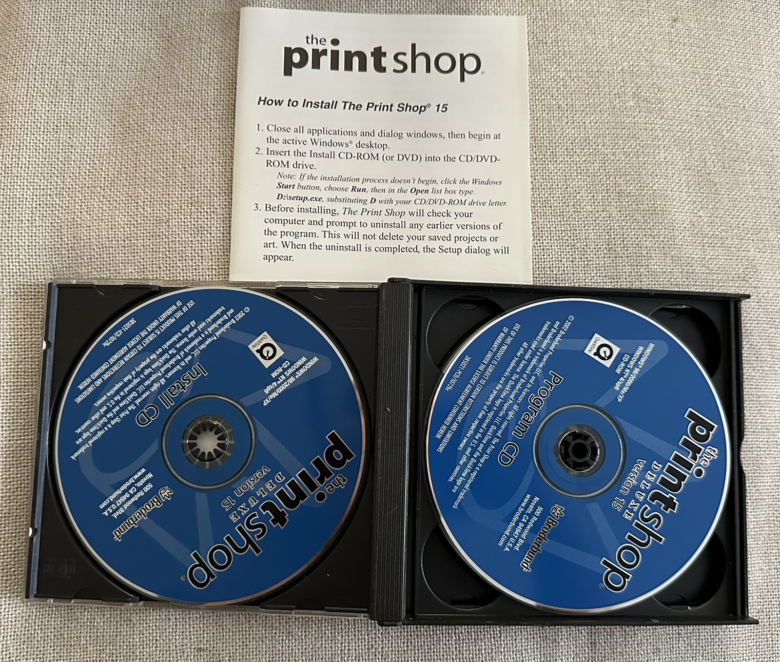 2002 Printshop Deluxe Version 15 Broderbund CD rom PC 4 Disc set edit software