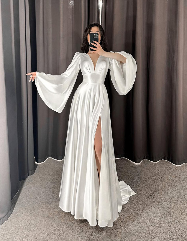 как выглядит Satin Elegant Wedding Dress Long Puff Sleeve V-Neck High Side Spilt Bridal Gown фото
