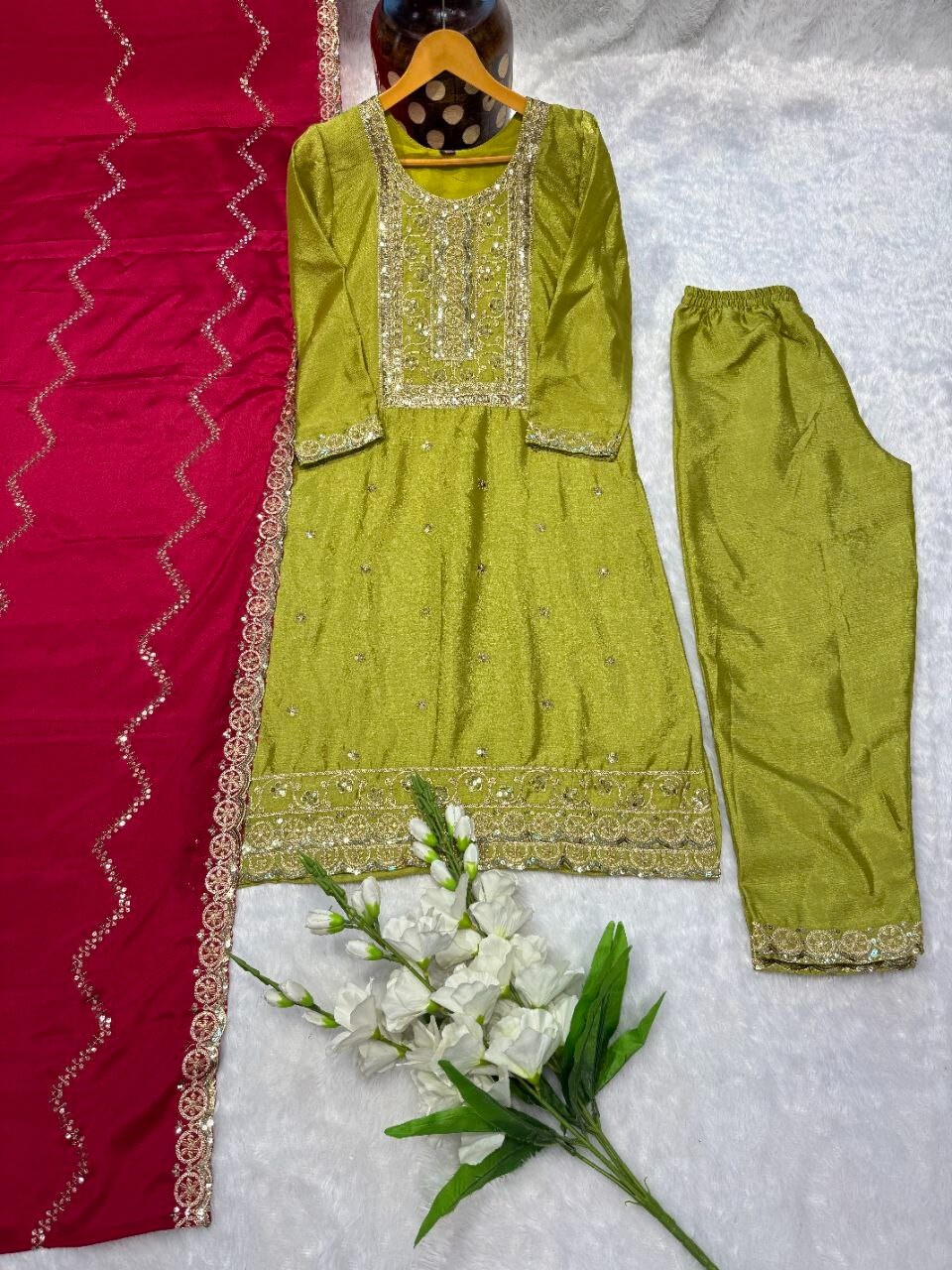 как выглядит New Arrival Chinnon Silk Salwar Kameez With Pink Dupatta For Festival Wear фото