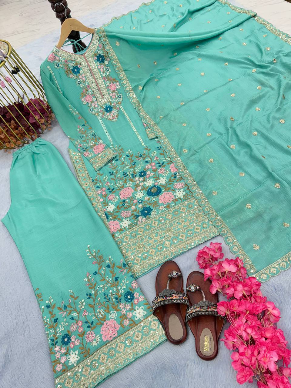 Latest New Heavy Chinnon Designer Top Palazzo With Sky Blue Dupatta For Women