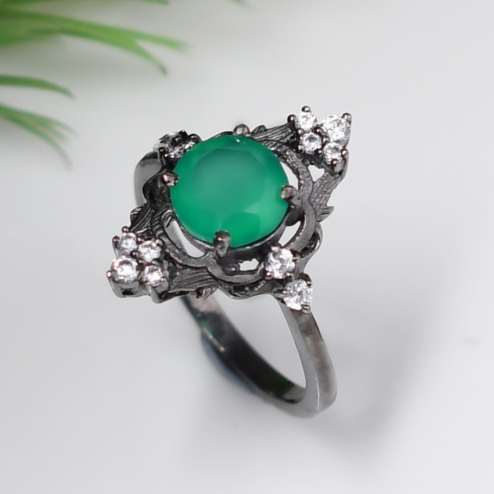 Natural Green Onyx Ring 925 Sterling Silver Round Gemstone Ring Wedding Ring
