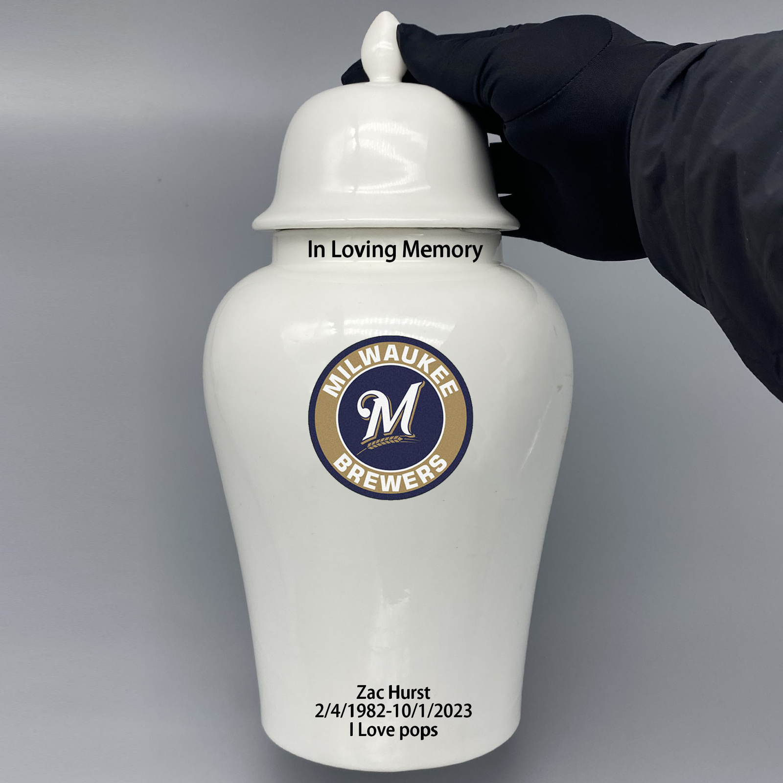 Ceramic Large Urn for Milwaukee Brewers Baseball Theme, Custom Text Number