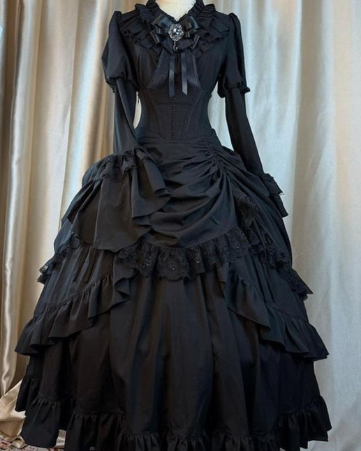 Gothic Black Satin Wedding Dresses Full Length Long Sleeve Ruffly Bridal Gowns